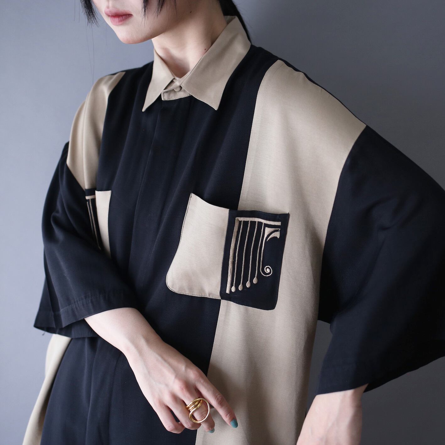 "ブラック×ベージュ"のパッと見でわかる良配色、モードに振ってもよし、カジュアルやストリート、モダンな服装に合わせても使いやすい抜群の汎用性とこれ一枚で様になる手軽さは夏の一枚として完璧かと◎