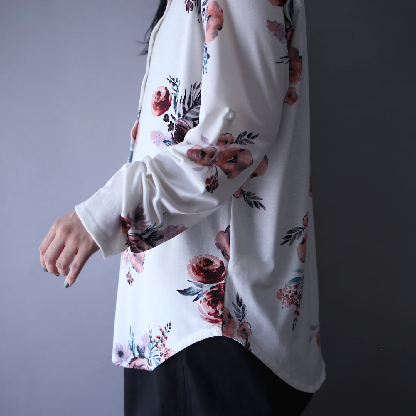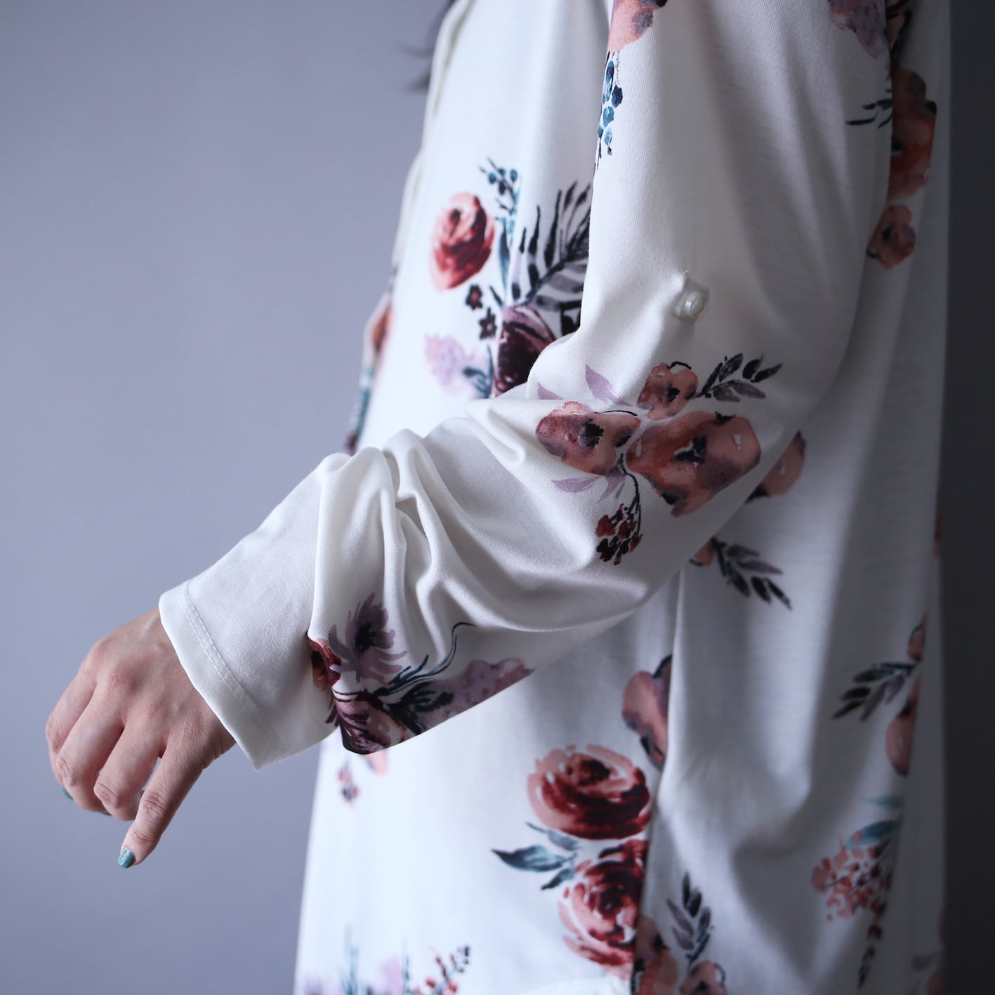 ミソとなる花柄は淡く水彩絵の具で描かれたような哀愁感漂うノスタルジックな仕上がり、白地のキャンパスに映える美しい色使いにも心を鷲掴みにされちゃいます…。