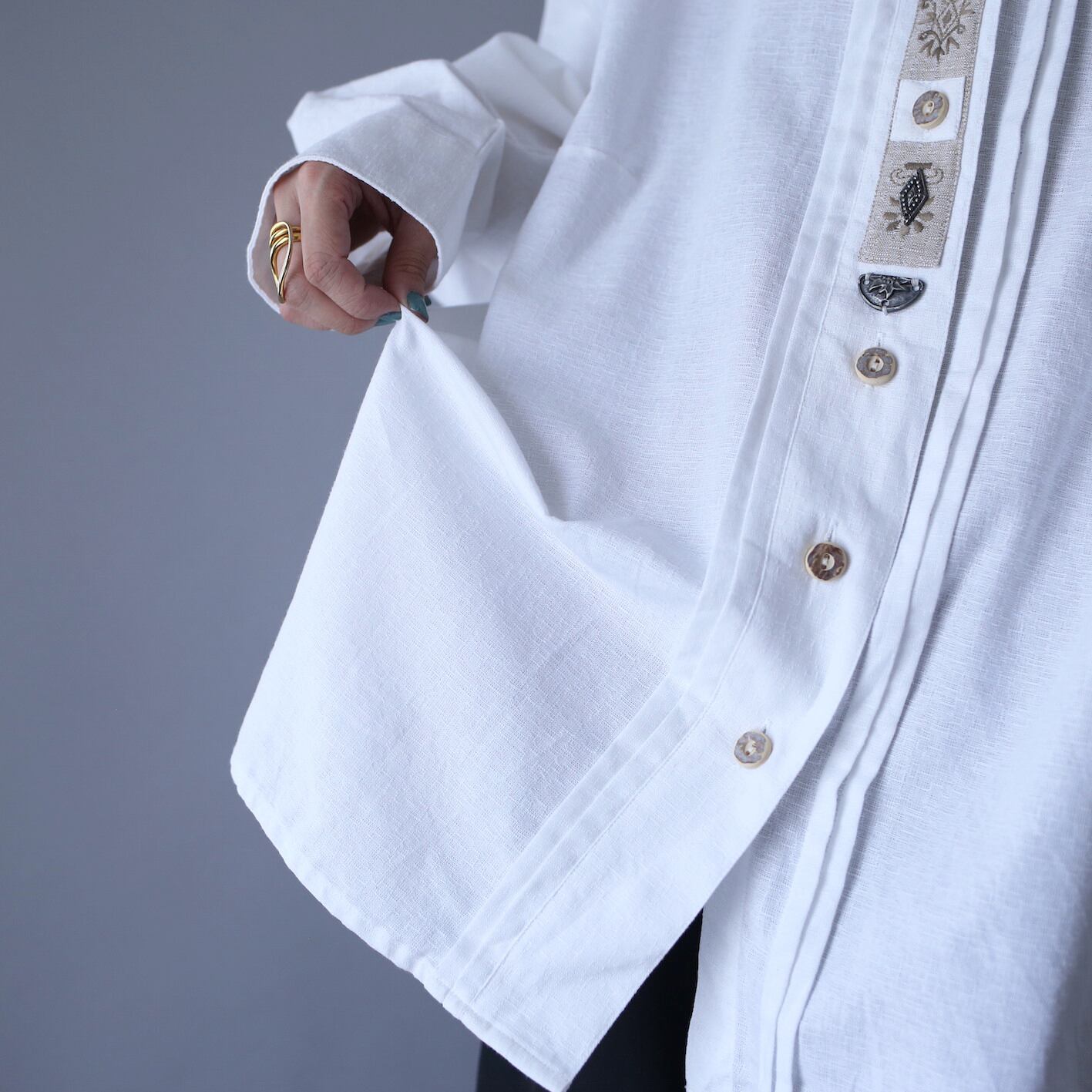 夏映え確定な白ボディ、中央にはトグルボタンや刺繍、メタリックなオーナメントが装飾として施されたチロリアンシャツの入荷となります◎