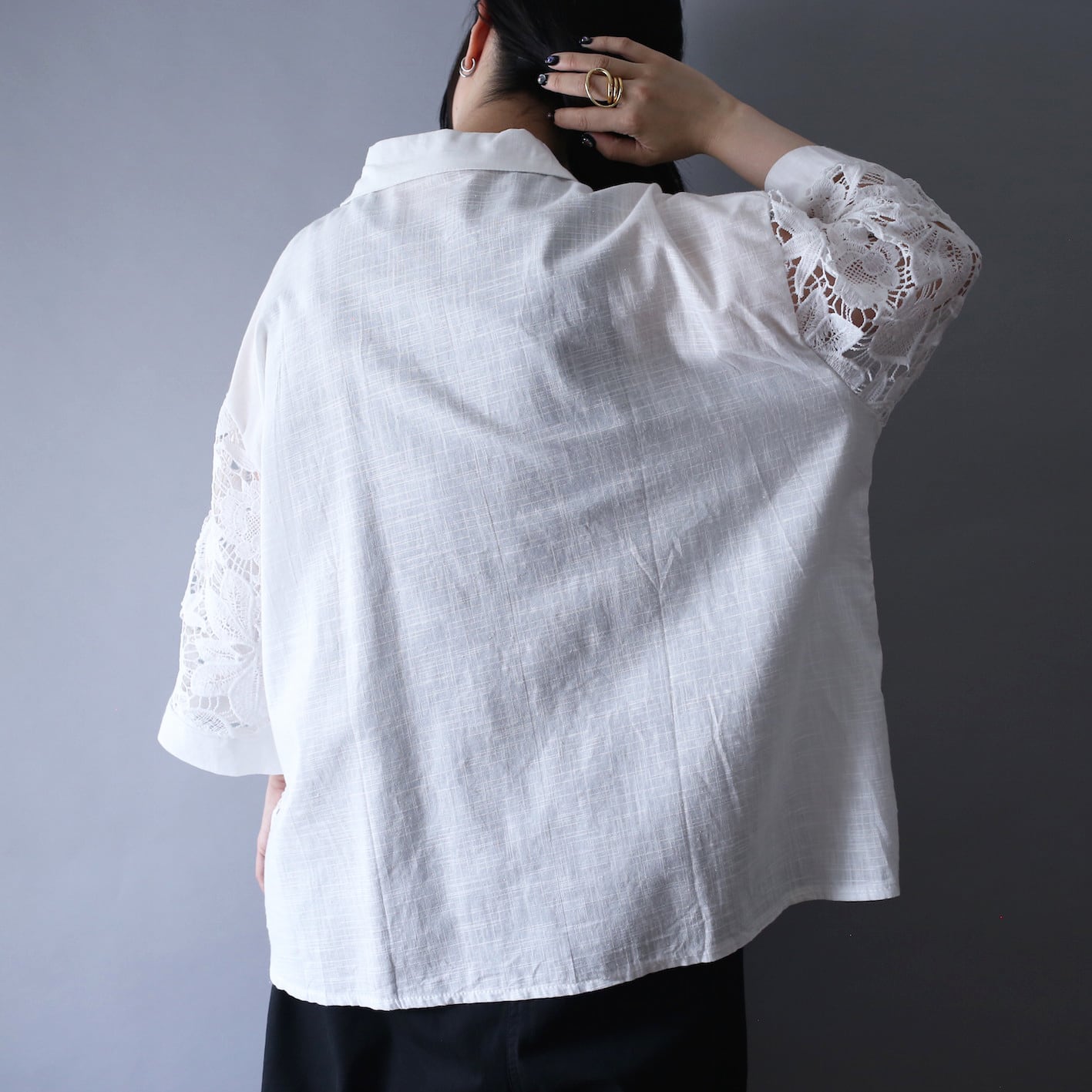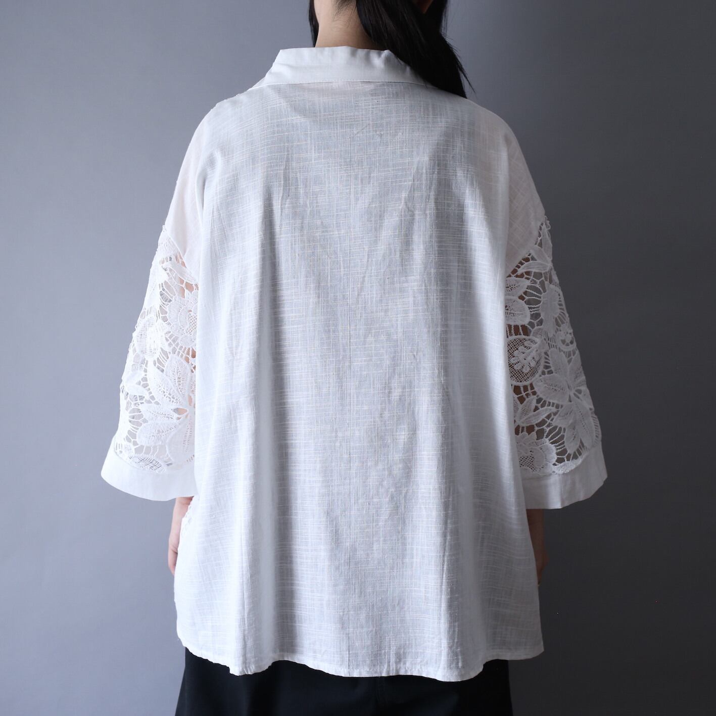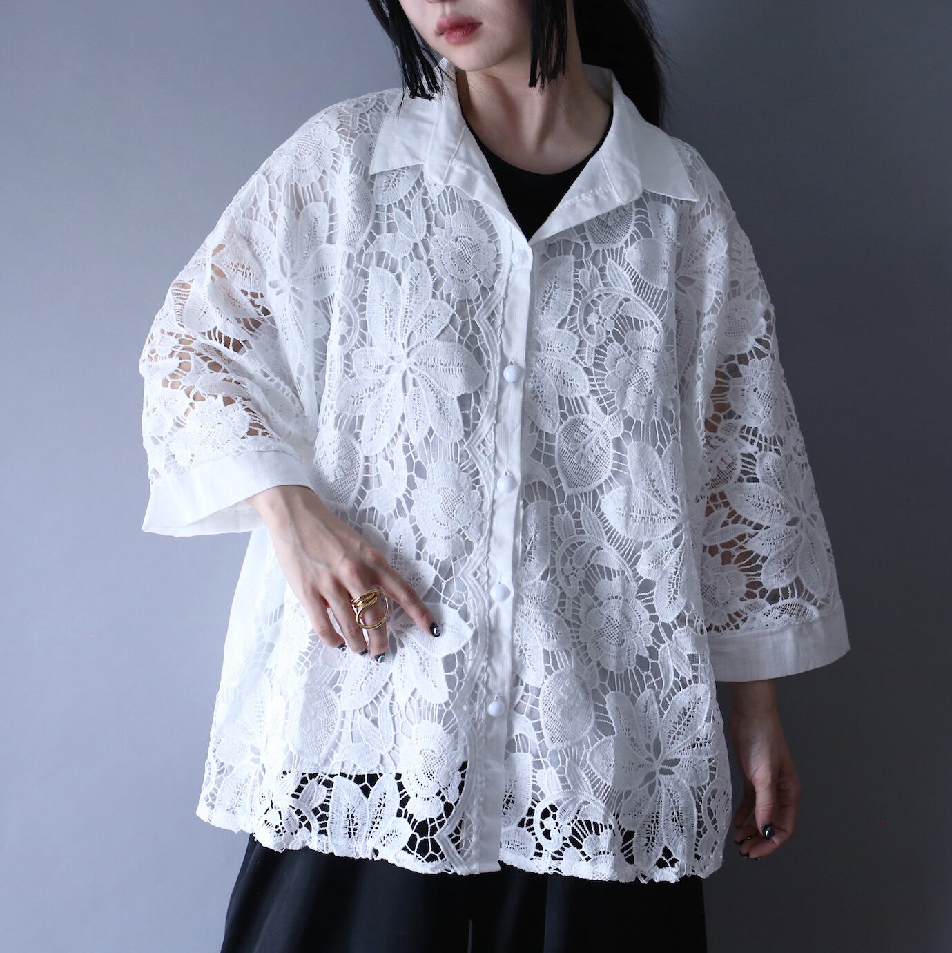 フロントと袖部分にレースを施し透け感MAX、理想的なBOXシルエットに袖かなり長めとシルエットも完璧な開襟シャツきました。