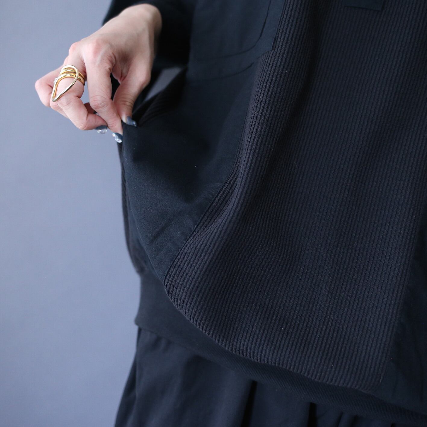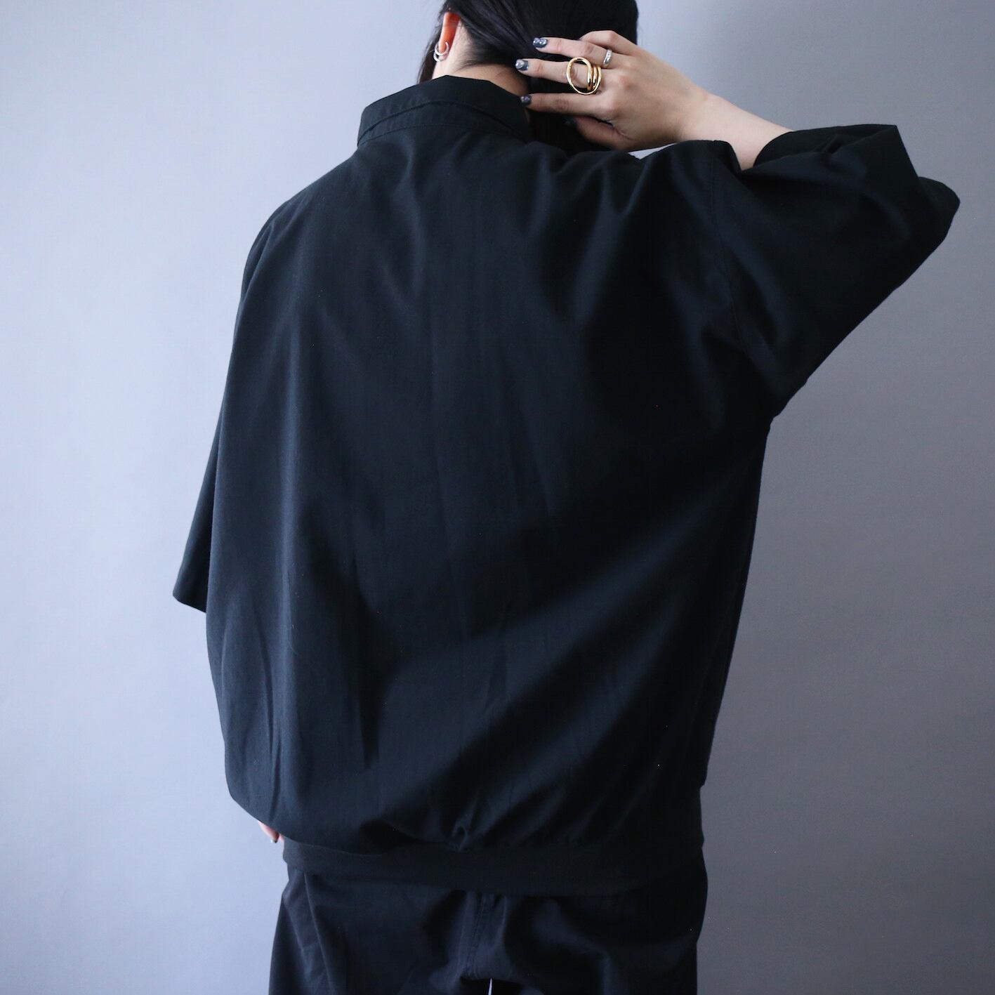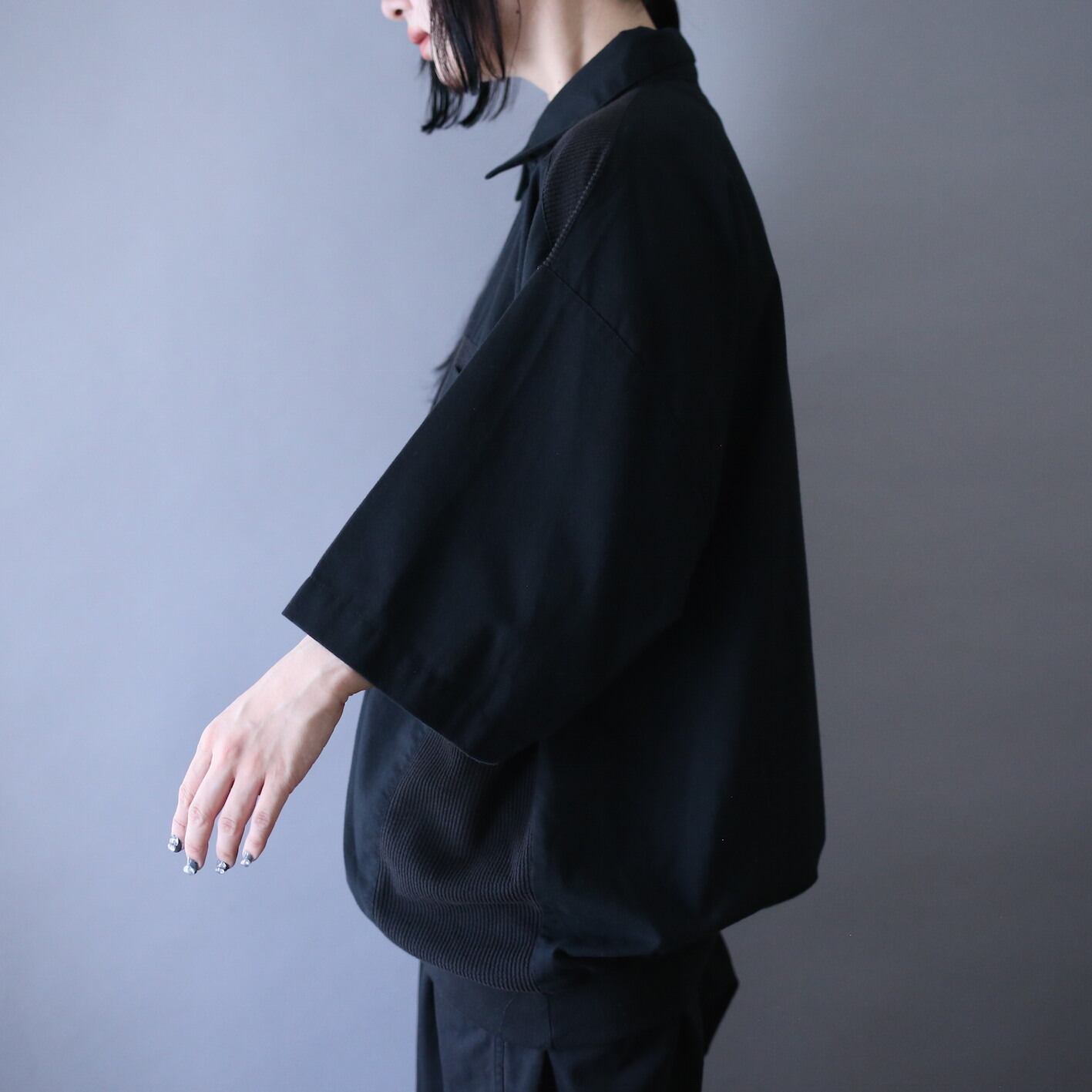 汎用性抜群のブラックボディ、さりげなく施された異素材切り替えで奥行きをプラス、"オーバーサイズ×裾リブ"によって生地の溜まり具合も抜群に仕上がった極美シルエットシャツプルオーバー来ました✌︎