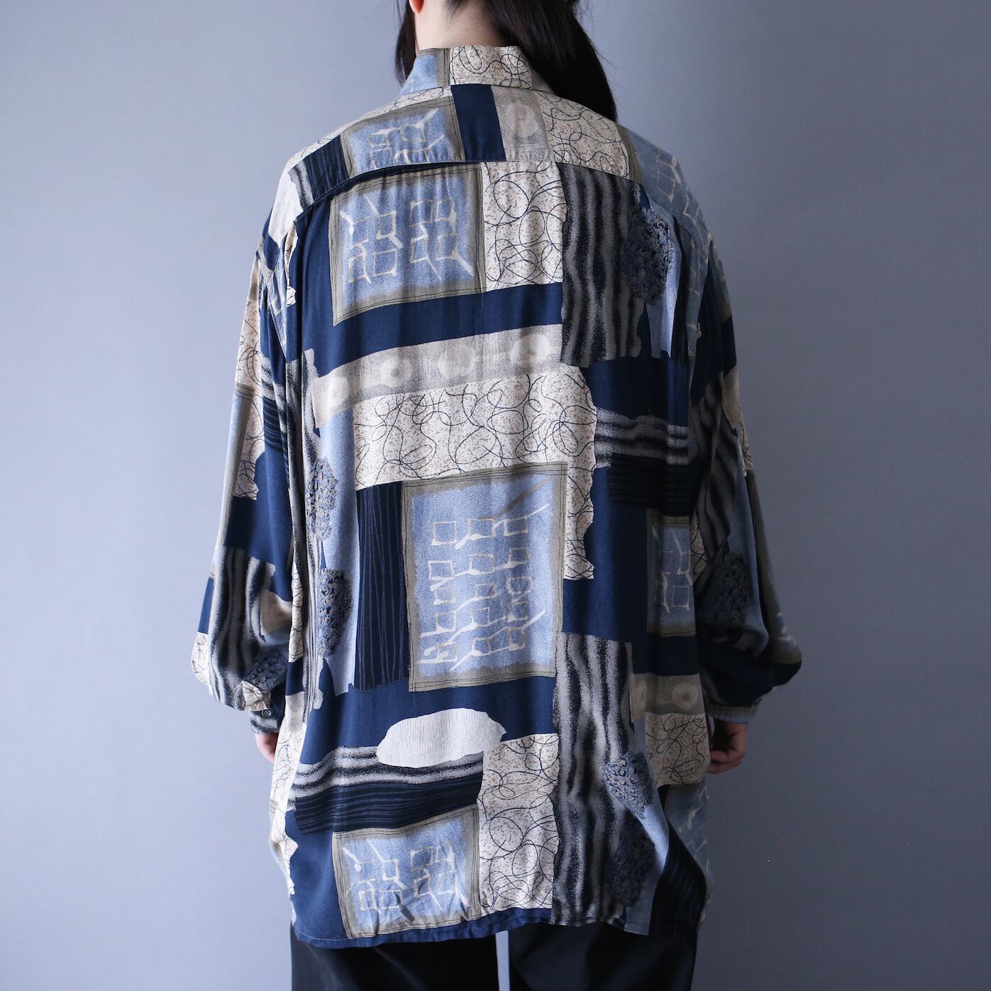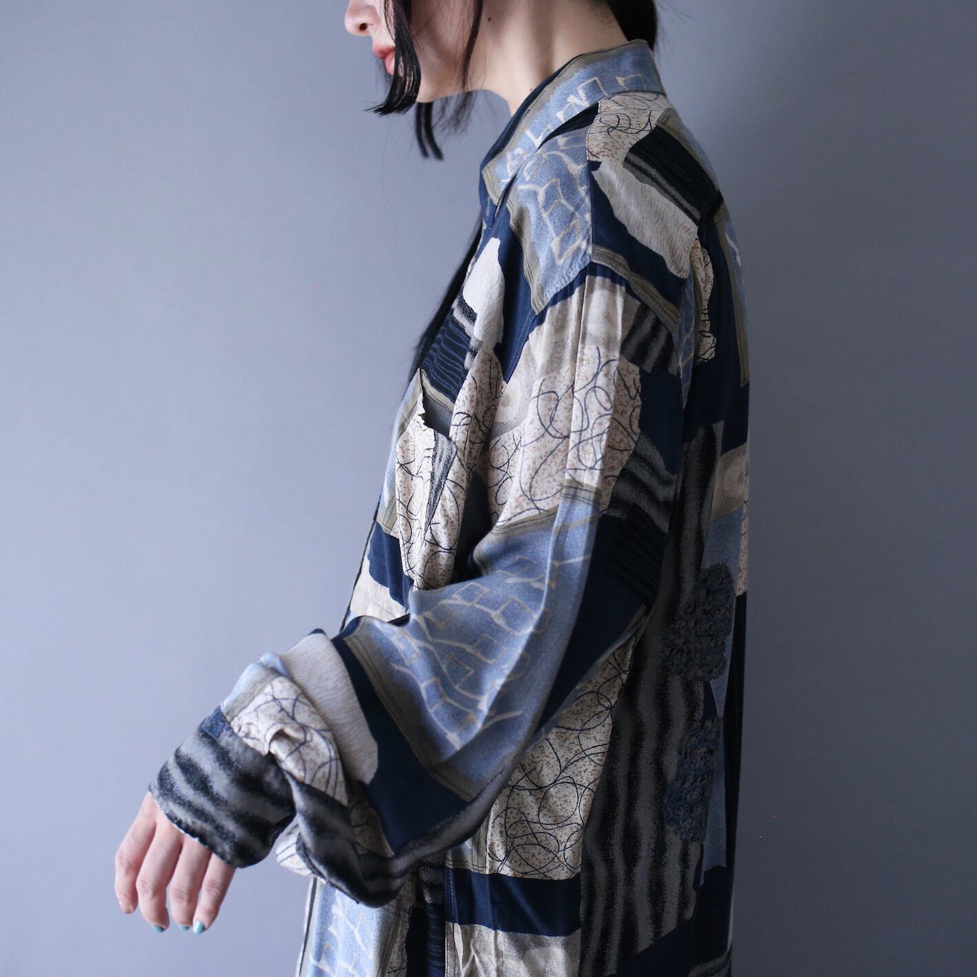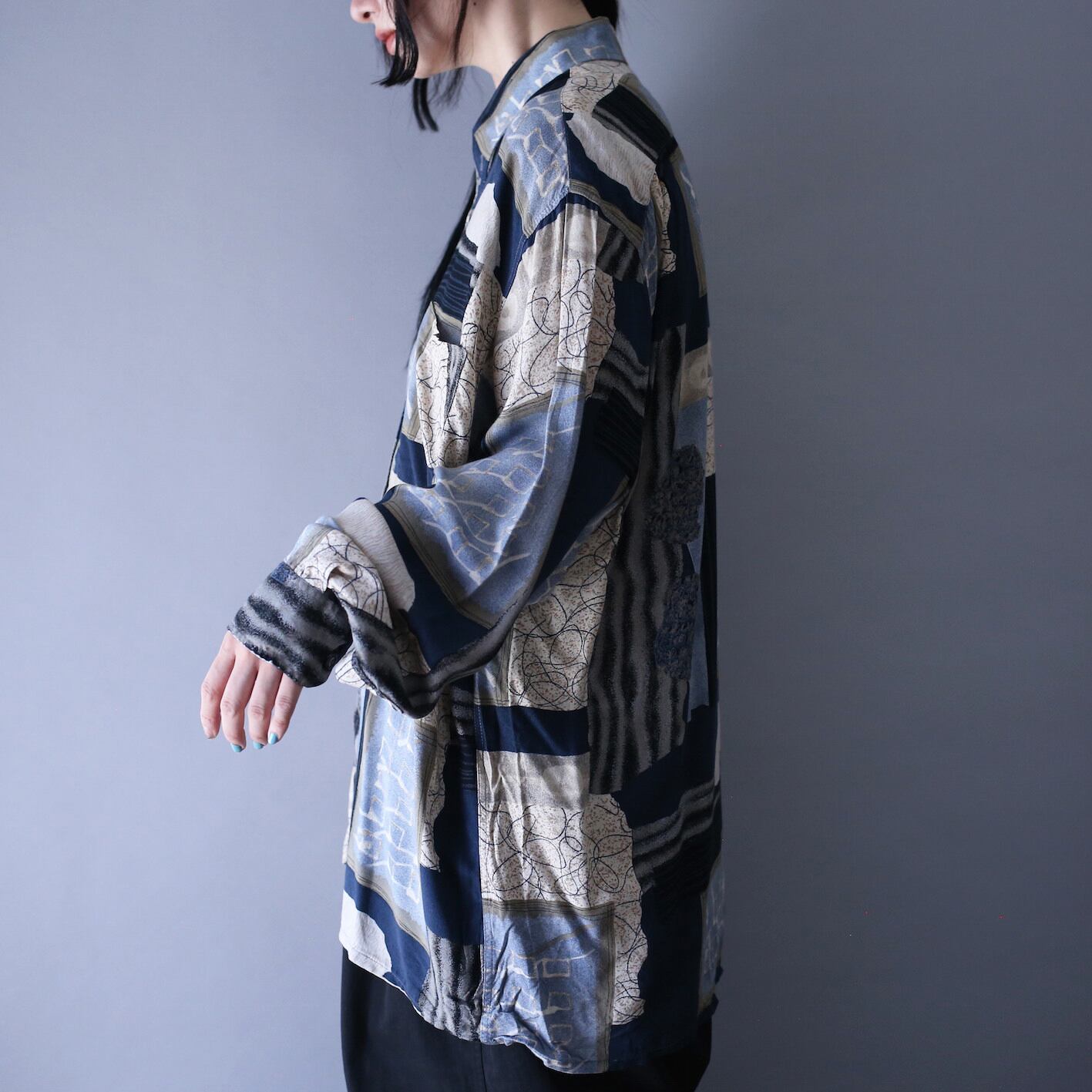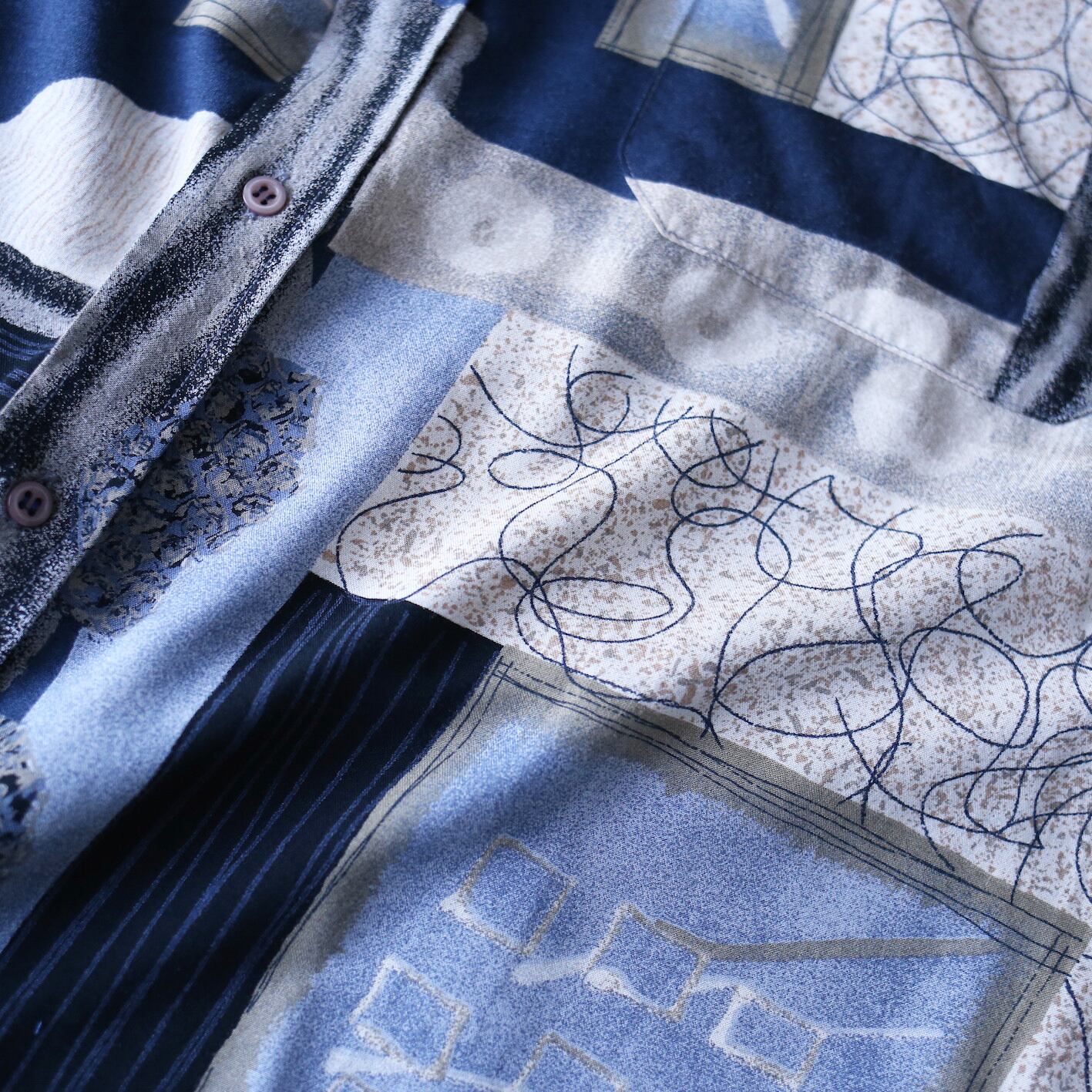 淡い寒色ベースの良配色、儚げな抽象柄のデザインパターンが幻想的な世界観を作り出す総柄シャツをご紹介。