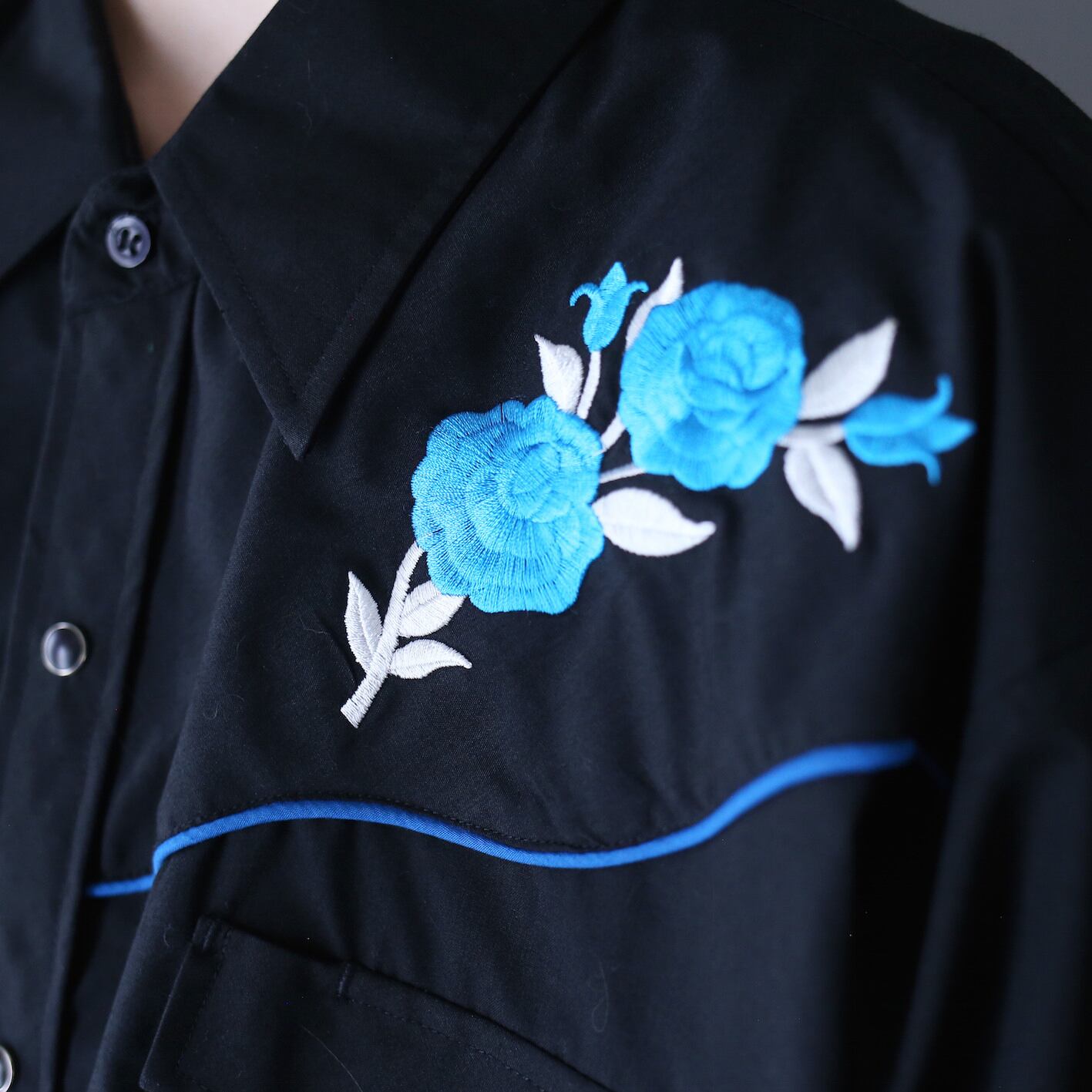 ブラックベースにターコイズブルーの立体的な刺繍とパイピング、V字型のフラップやマットなボタンが個性を引き出すモードウエスタンシャツ入荷しました。