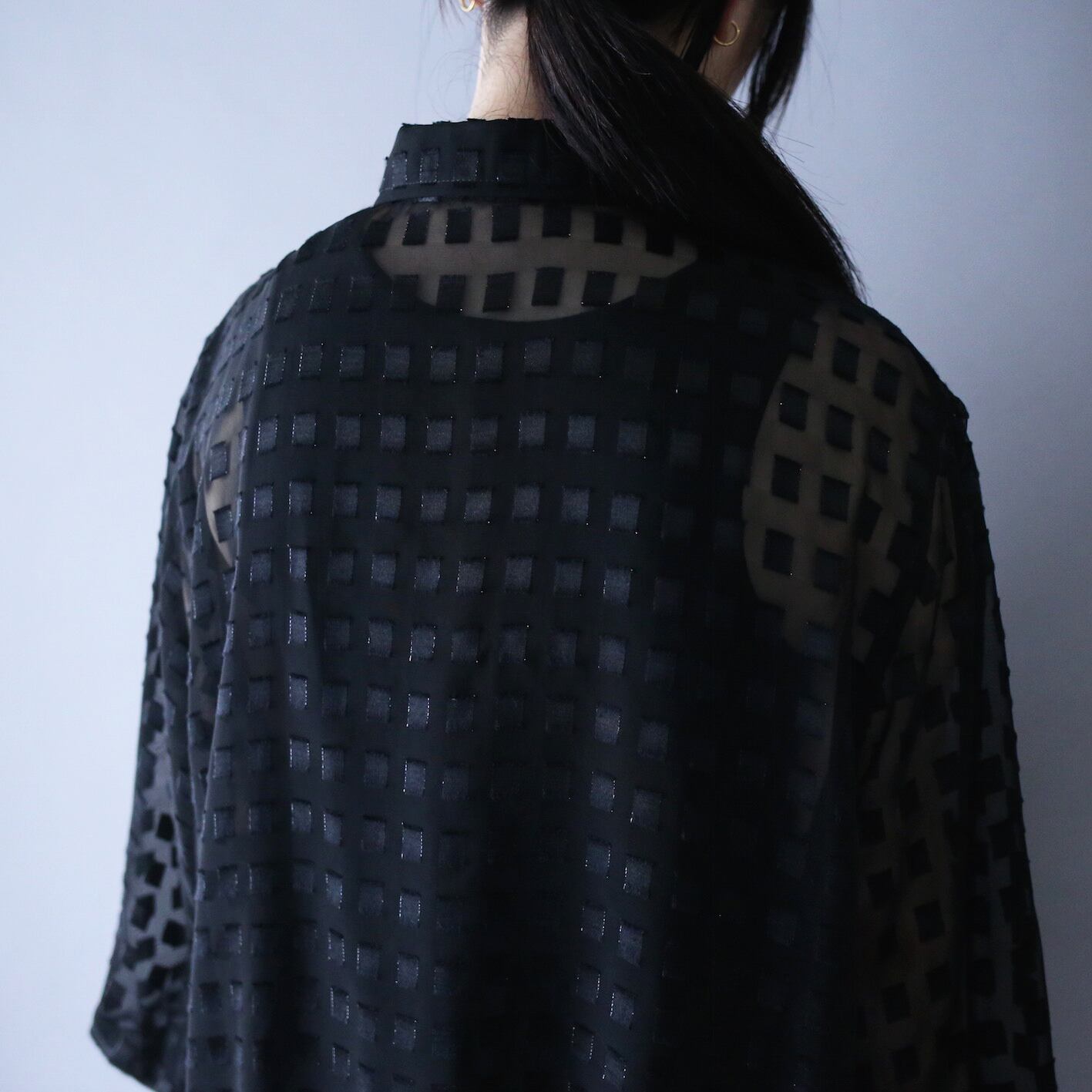 人気が高く当店で度々入荷しているテーピングシアーシャツ、今回は一味変わってクリスタルボタンを使用した1着をご紹介。