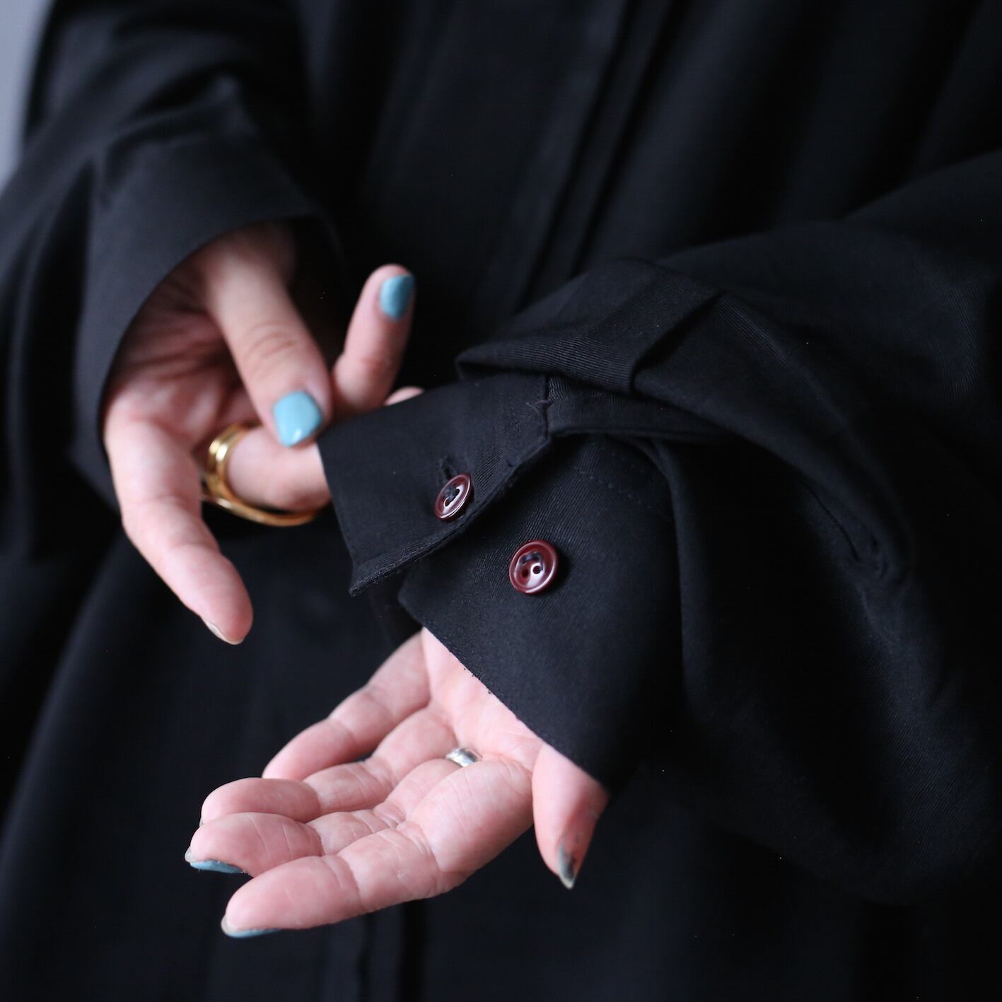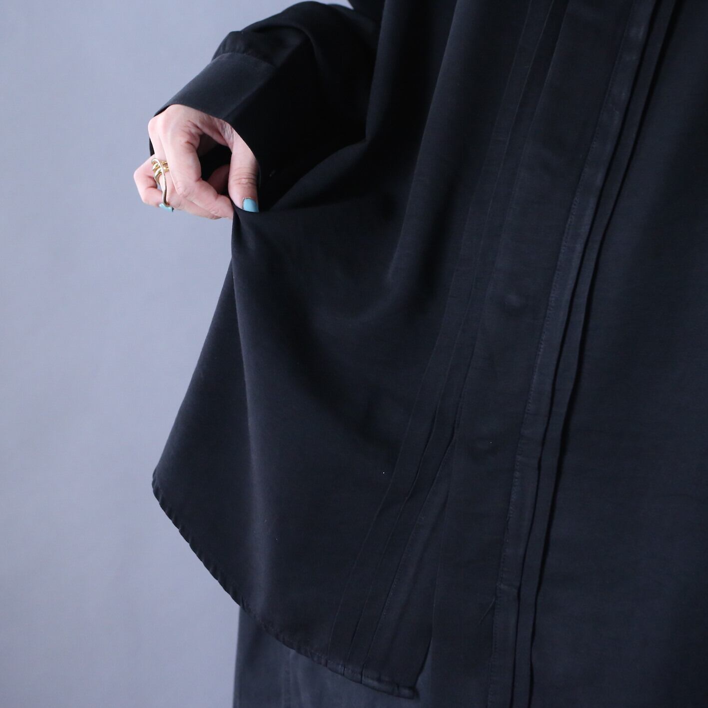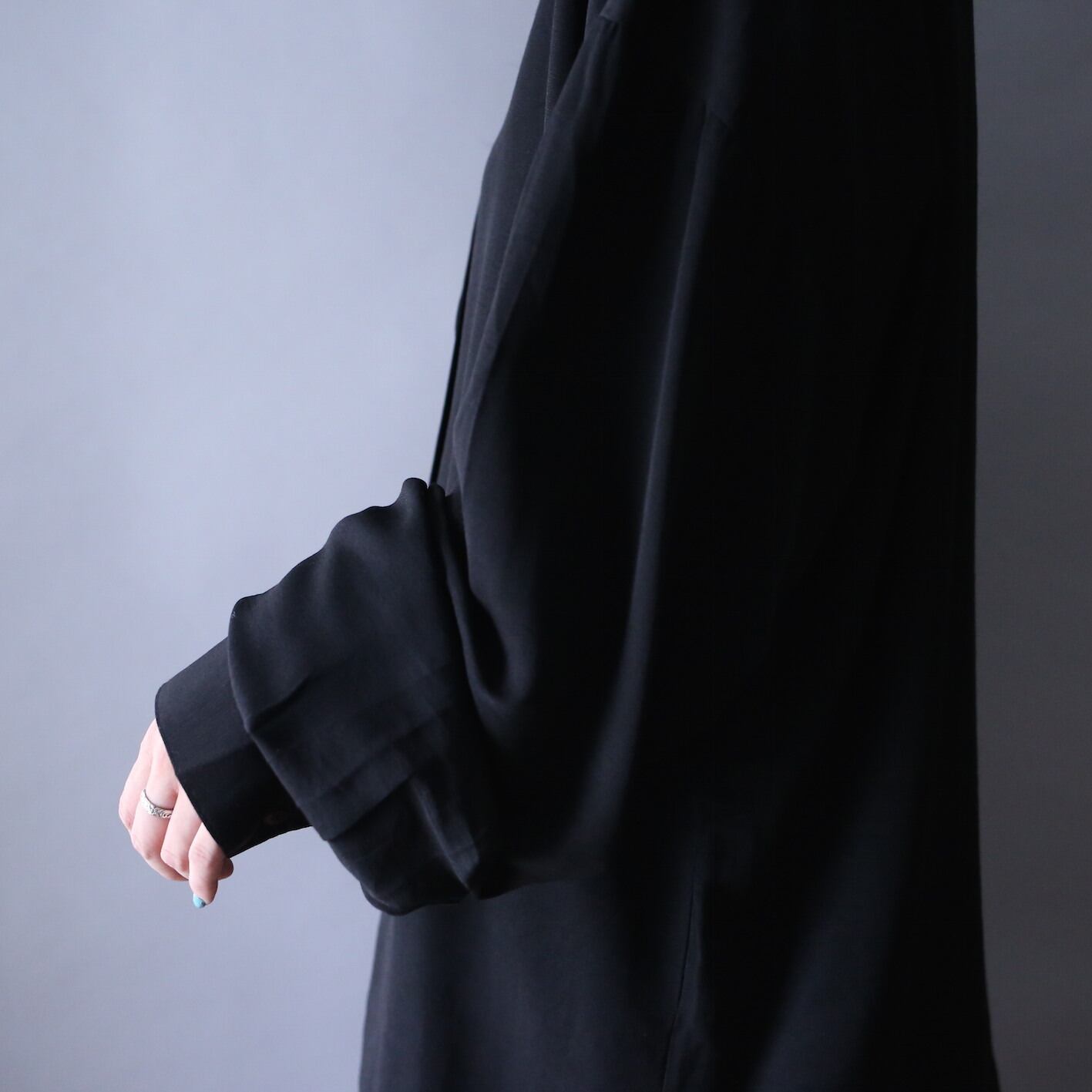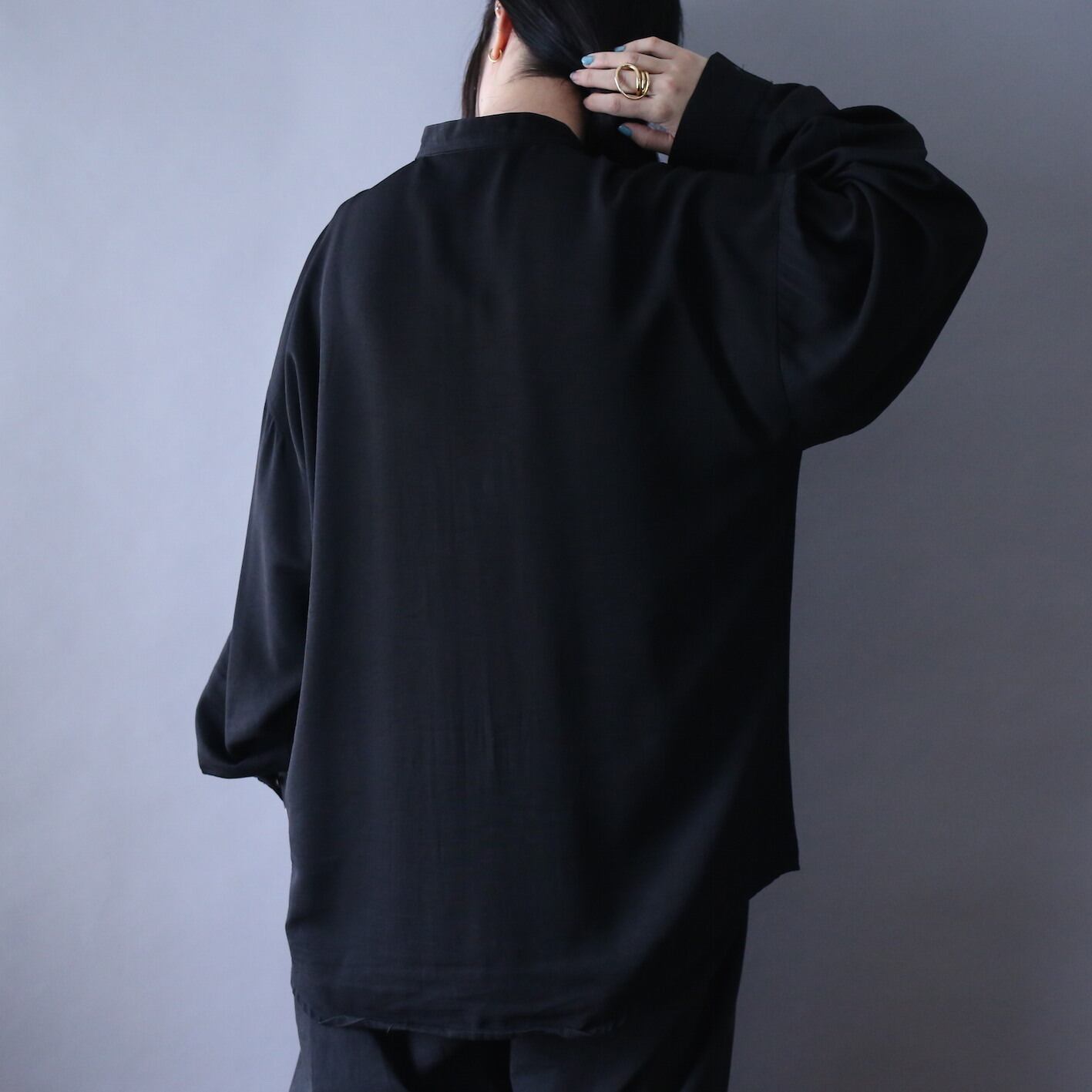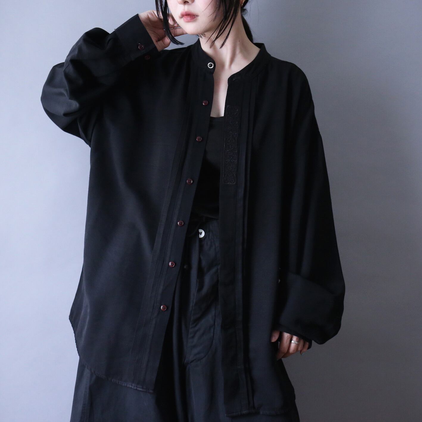 "刺繍" black one-tone pleats design fry-front band collar minimal mode shirt