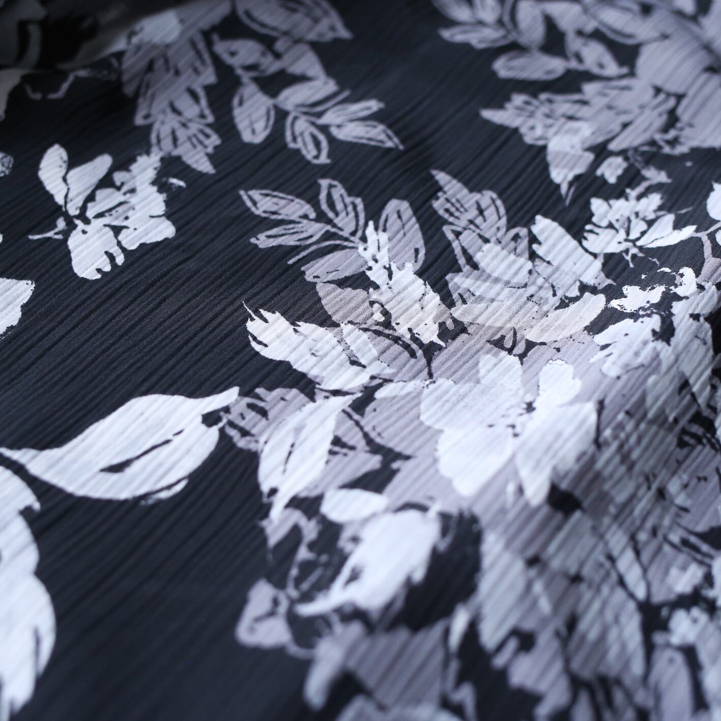 墨絵タッチの花柄、カラーを無彩色に制限することで総柄なのに上品で儚げなムードを演出。