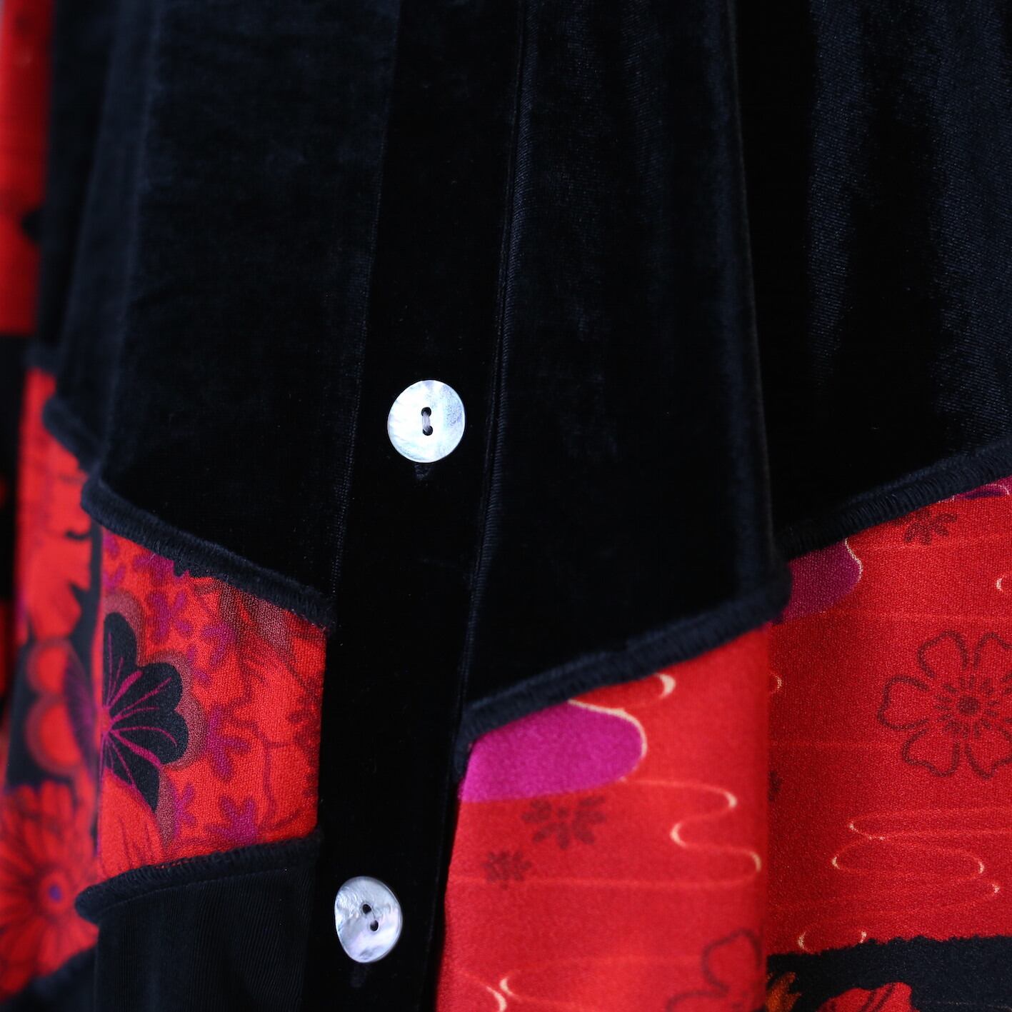 そして古着ならではのイッテンモノ感を醸し出しつつ、ハイブランドさながらのモード感を解き放つ和テイストで描かれた赤い花の切り替え。