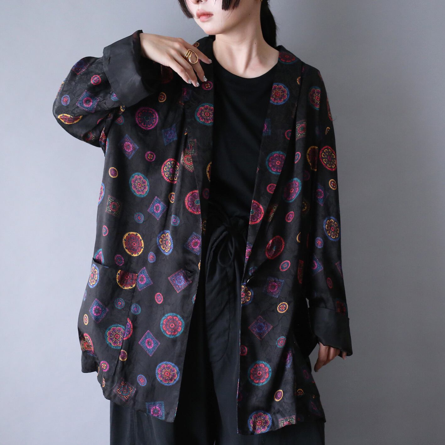 服全体には発色に優れた円形や菱形をモチーフとしたアート柄が満遍なく並べられており世界観をぐっと構築、古着らしいイッテンモノ感とハイブランドさながらの貫禄に惚れ惚れ。