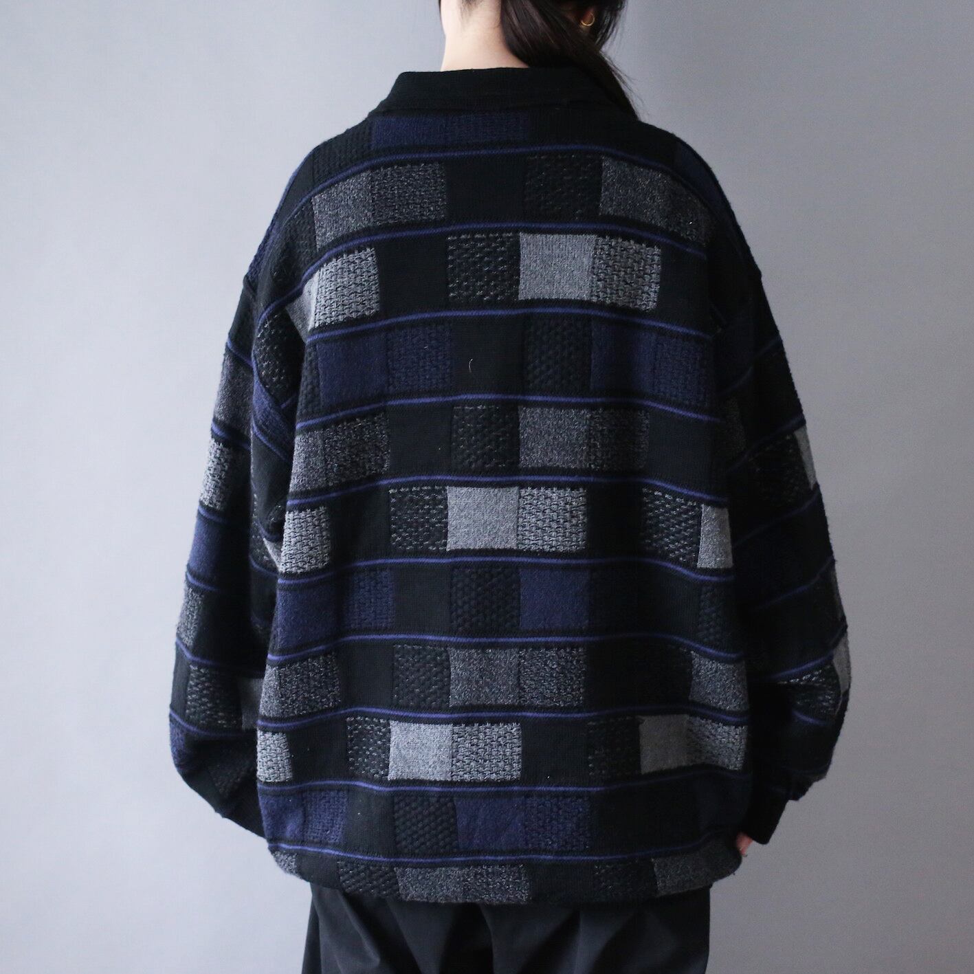 "ブラック×ブルー×グレー"の良配色、パネルごとに違った雰囲気を醸し出す特殊な柄、たっぷりと生地を使ったらオーバーサイズが極上のシルエットを生み出すニットプルオーバー。