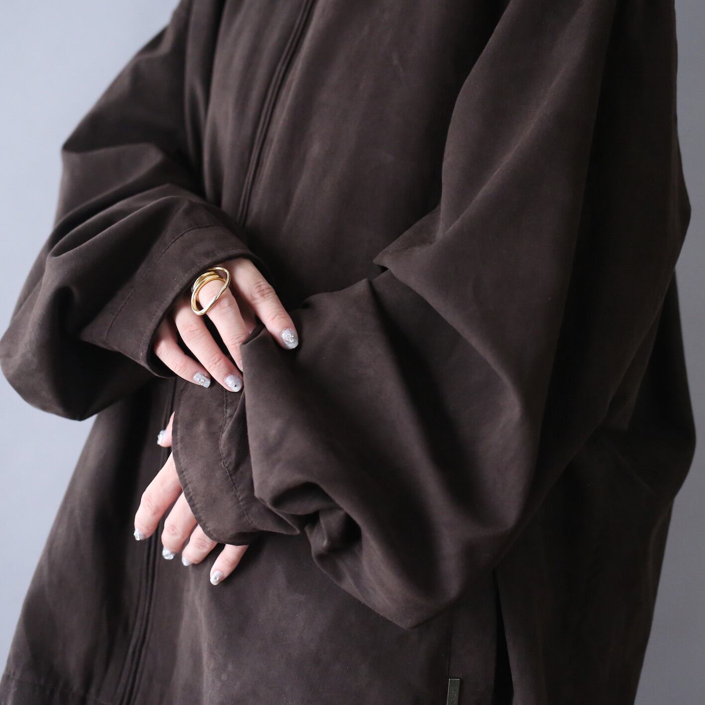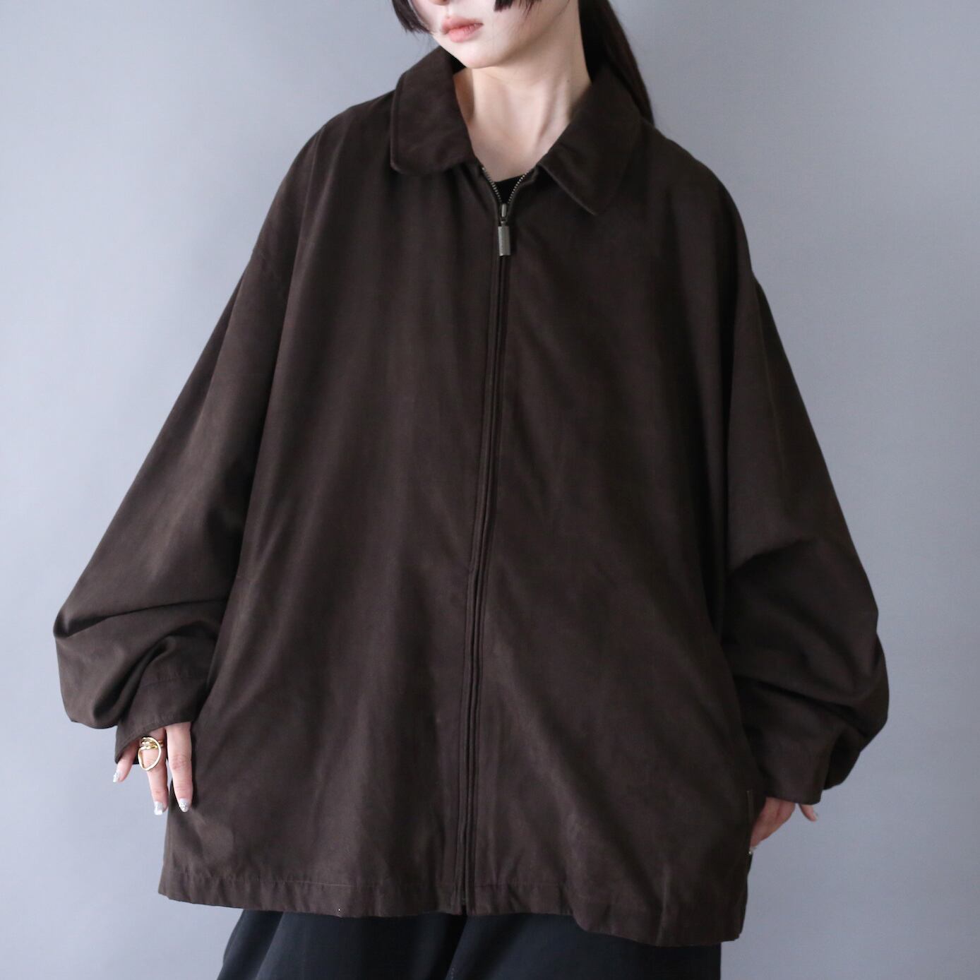シンプルながら破壊力バツグン、ガッツリとワイド広がる横長シルエットでありながら落ち感に優れた極美シルエット、フェイクスエード生地が重厚感と高級感をグイッと加速してくれるジップアップブルゾン。