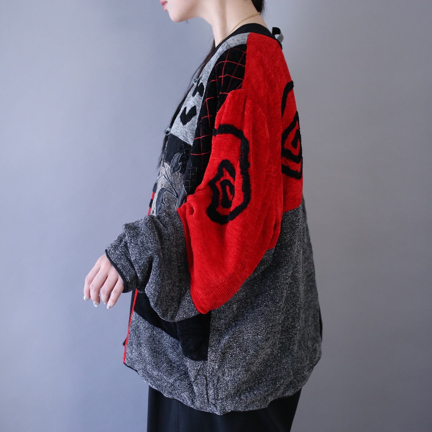 "刺繍" and multi fabric switching design over silhouette no-collar jacket