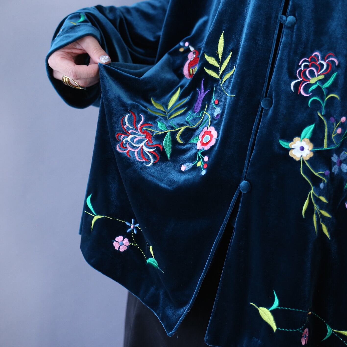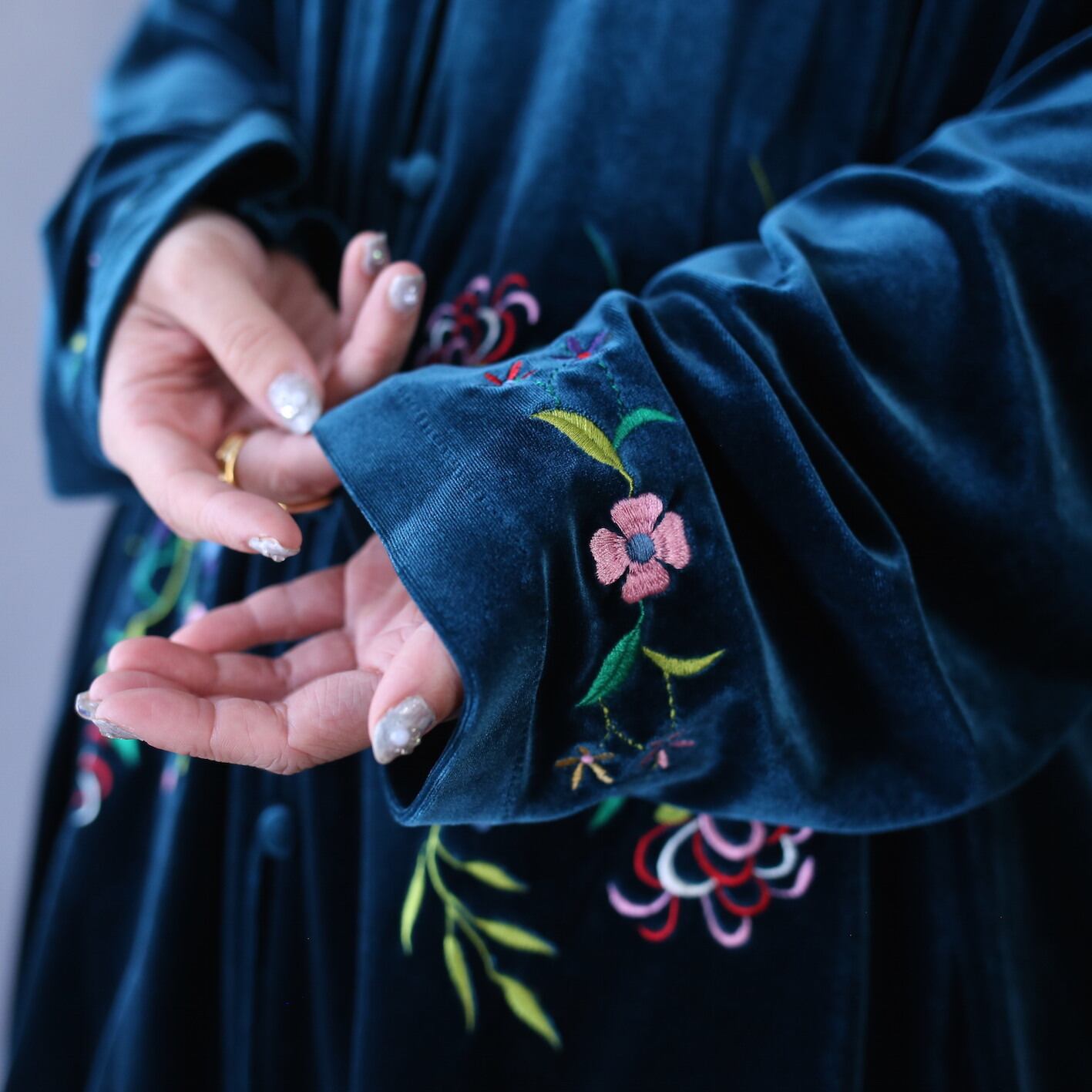 "花"と"鳥"の刺繍を360度に施した超〜贅沢なデザイン、密度をしっかりと感じる刺繍の丁寧さや色使いのきめ細かさ、配置バランスなもどれをとっても超一級品。ベロアにここまで刺繍が乗ることはまずないのでそれだけにこの服の価値の高さを感じ取れます…