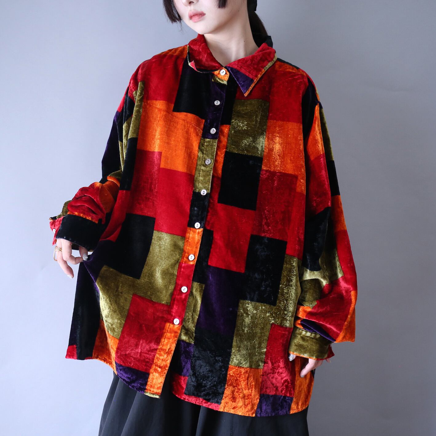 柄は様々な色を巧みに使い分けてパネルアートを形成、ベロア特有の光沢感も相まってキャッチーな見た目ながら同時にラグジュアリーな世界観を演出◎