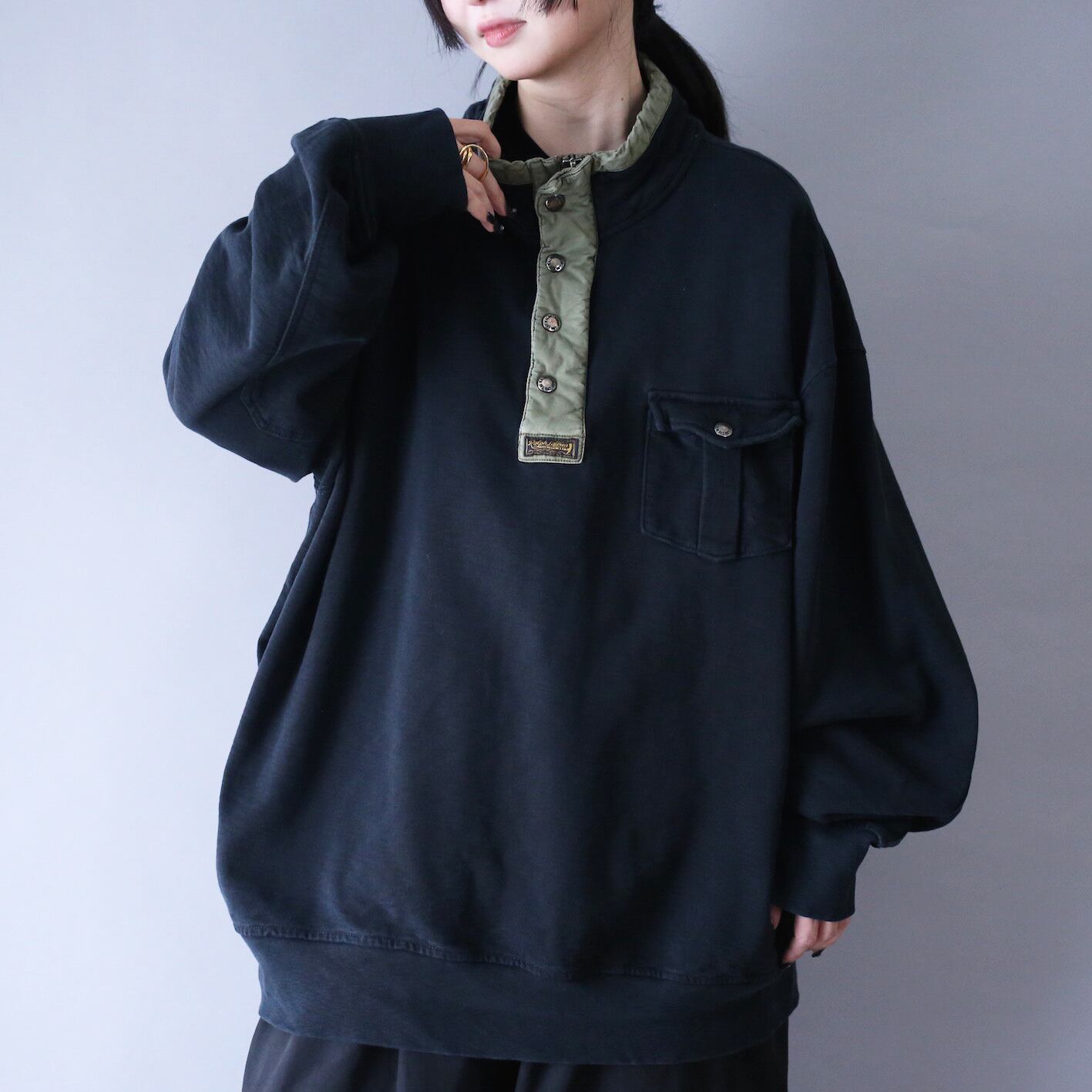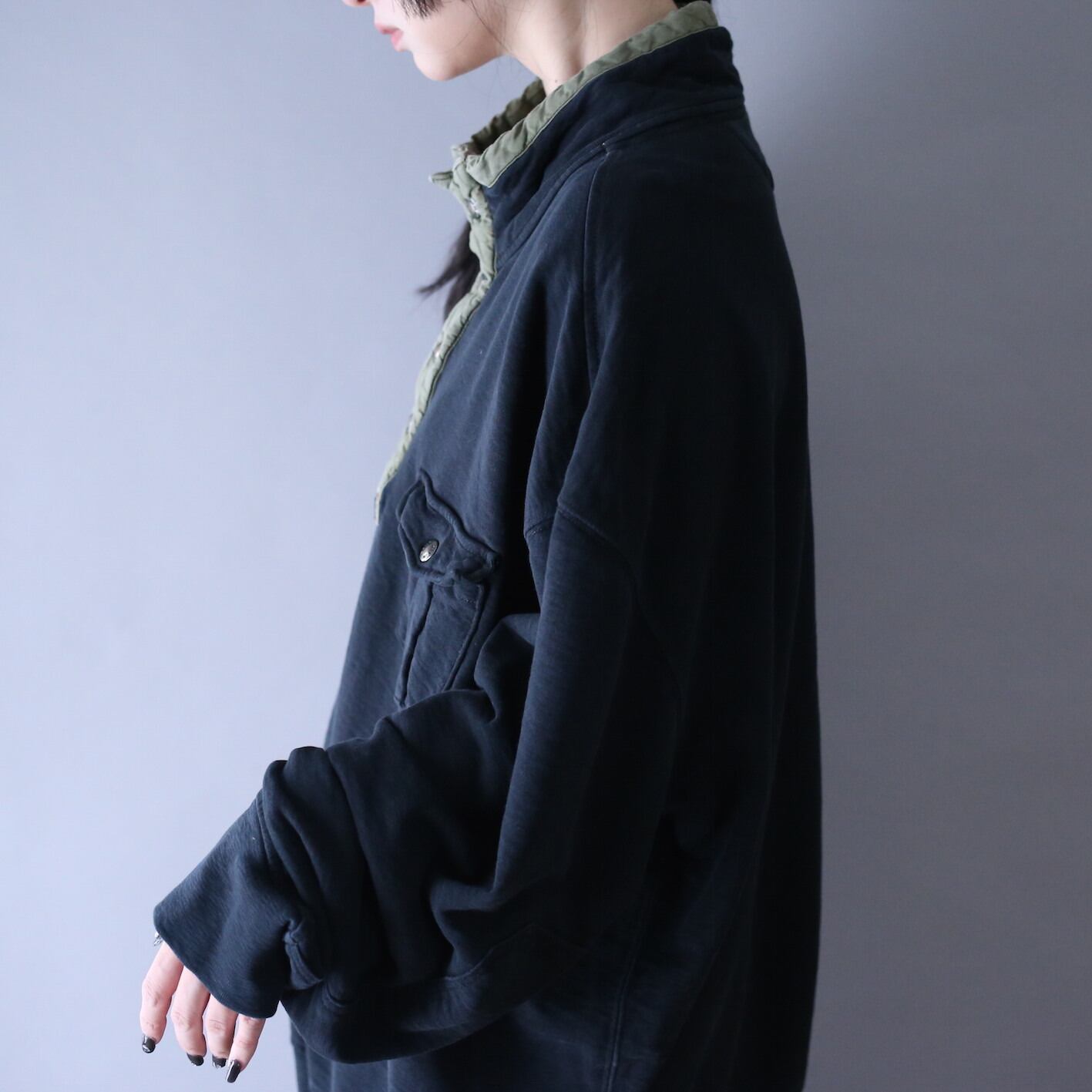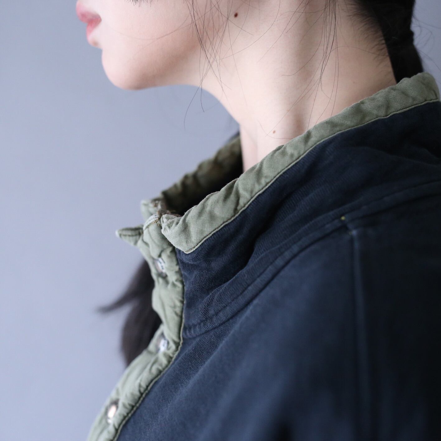 襟はスポーティーからカジュアルまで一枚でこなすことのできる"ハイネック×ハーフジップ"、配色やシワ感、モコモコと重厚感のある切り替えにメタリックなデザインボタンがミリタリー感を一層強調、立ててスタイリッシュに決めても良し、寝かせてインナーをチラ見せしつつネックレスでアクセントを付けても間違いなし◎