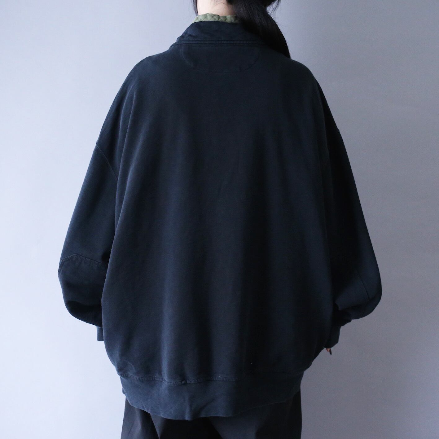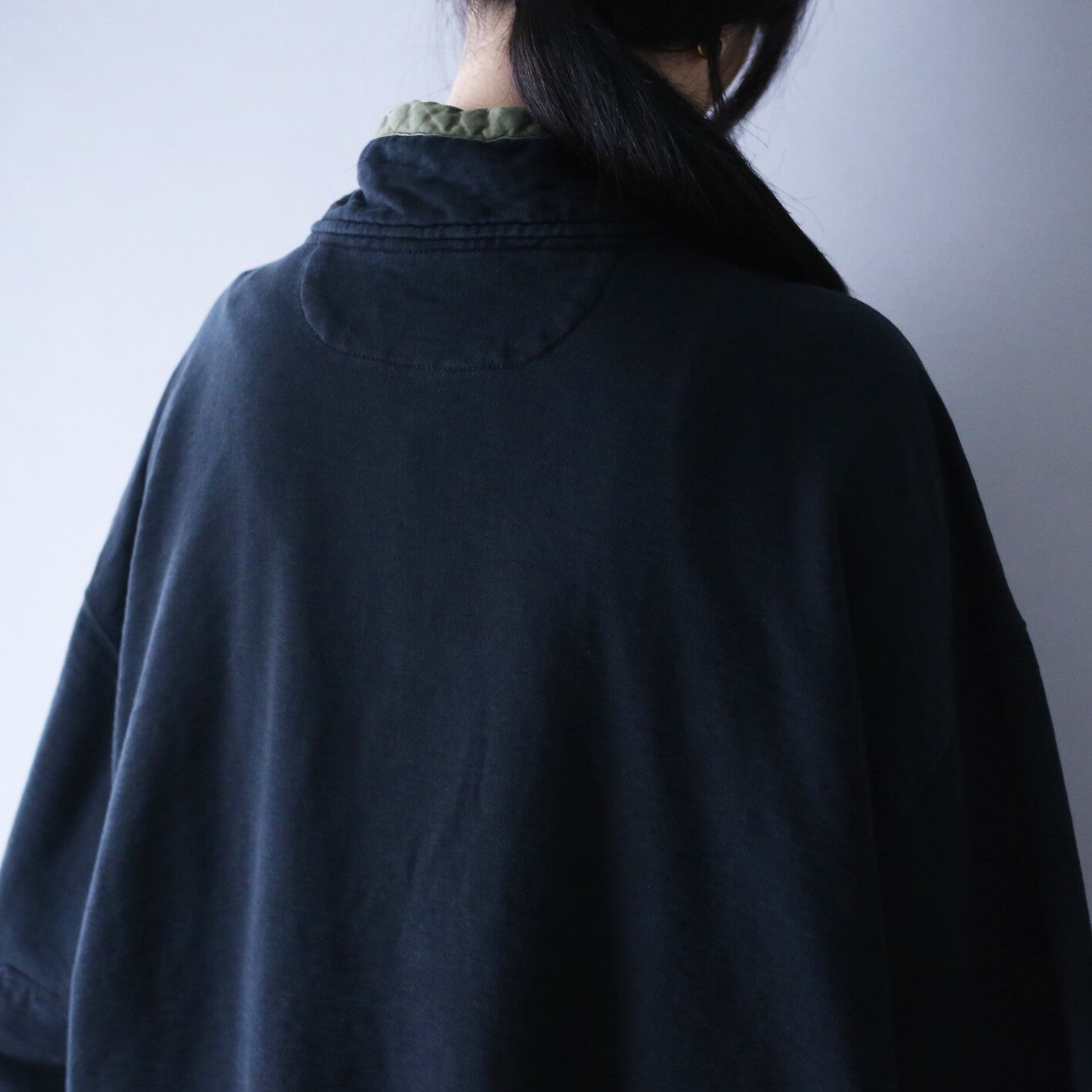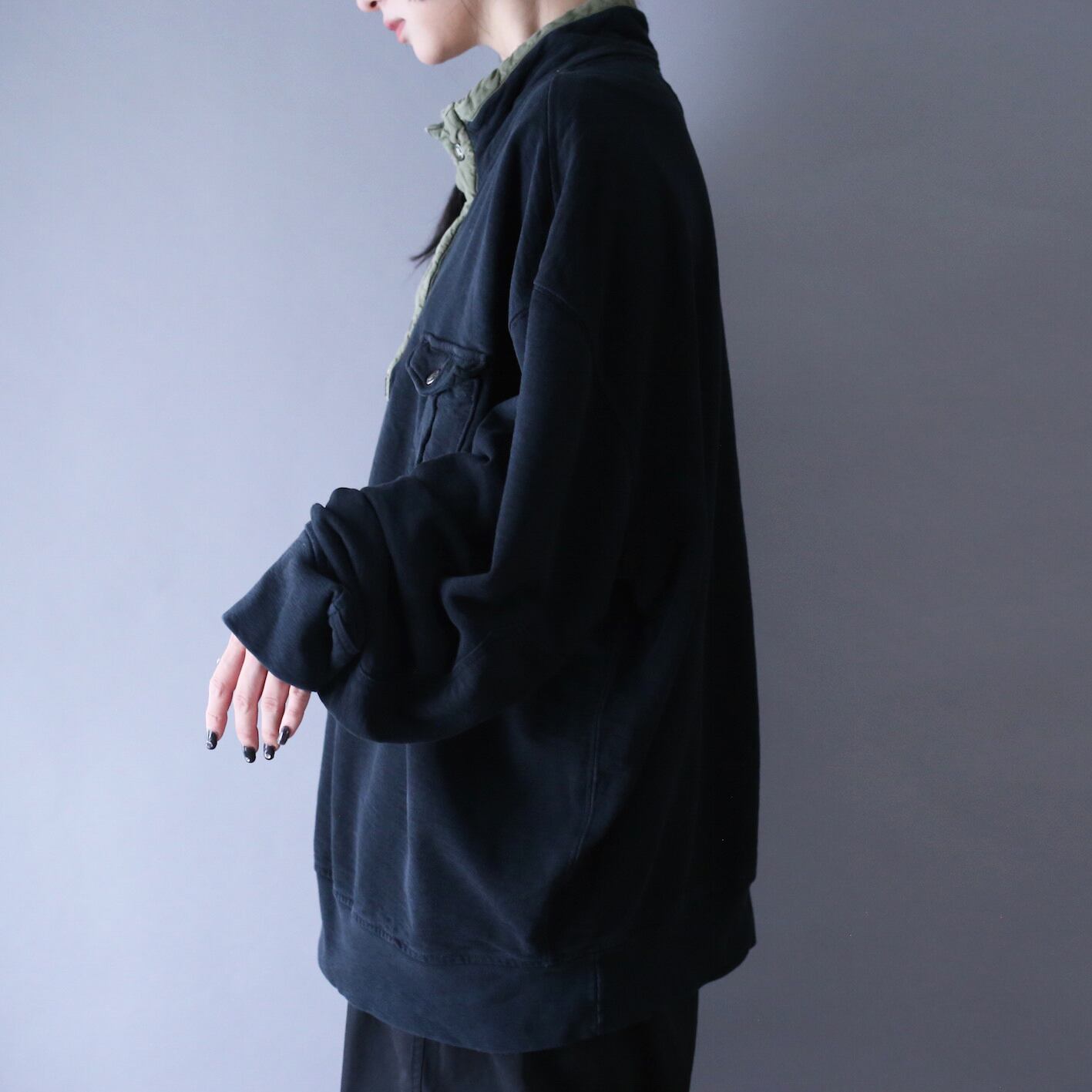 襟はスポーティーからカジュアルまで一枚でこなすことのできる"ハイネック×ハーフジップ"、配色やシワ感、モコモコと重厚感のある切り替えにメタリックなデザインボタンがミリタリー感を一層強調、立ててスタイリッシュに決めても良し、寝かせてインナーをチラ見せしつつネックレスでアクセントを付けても間違いなし◎