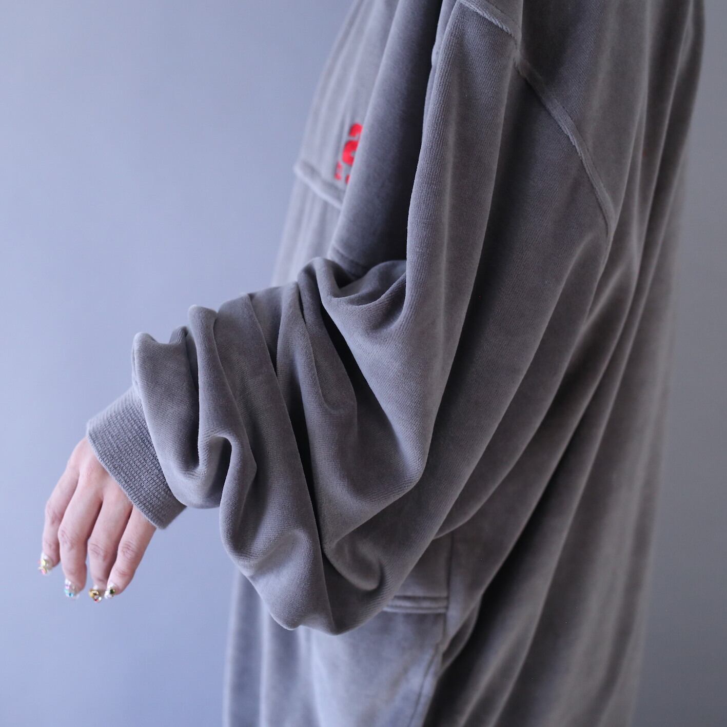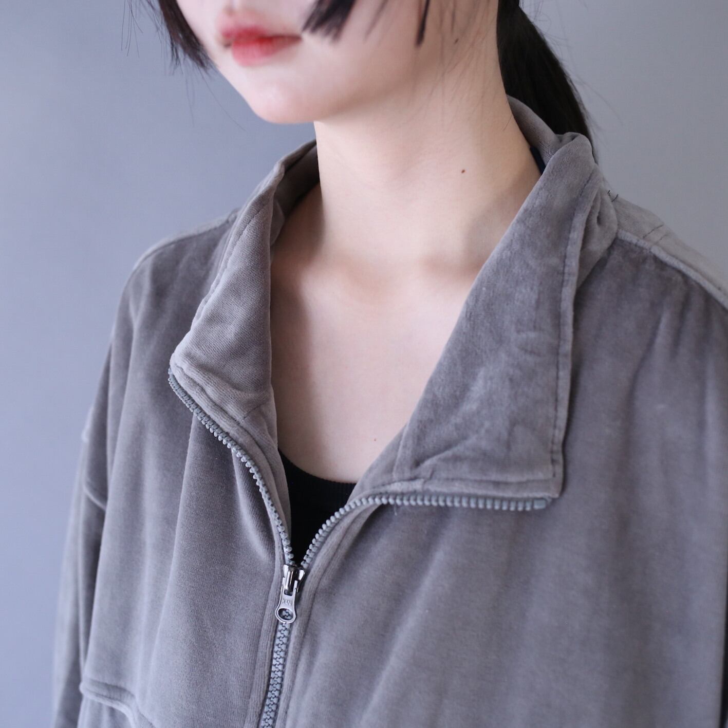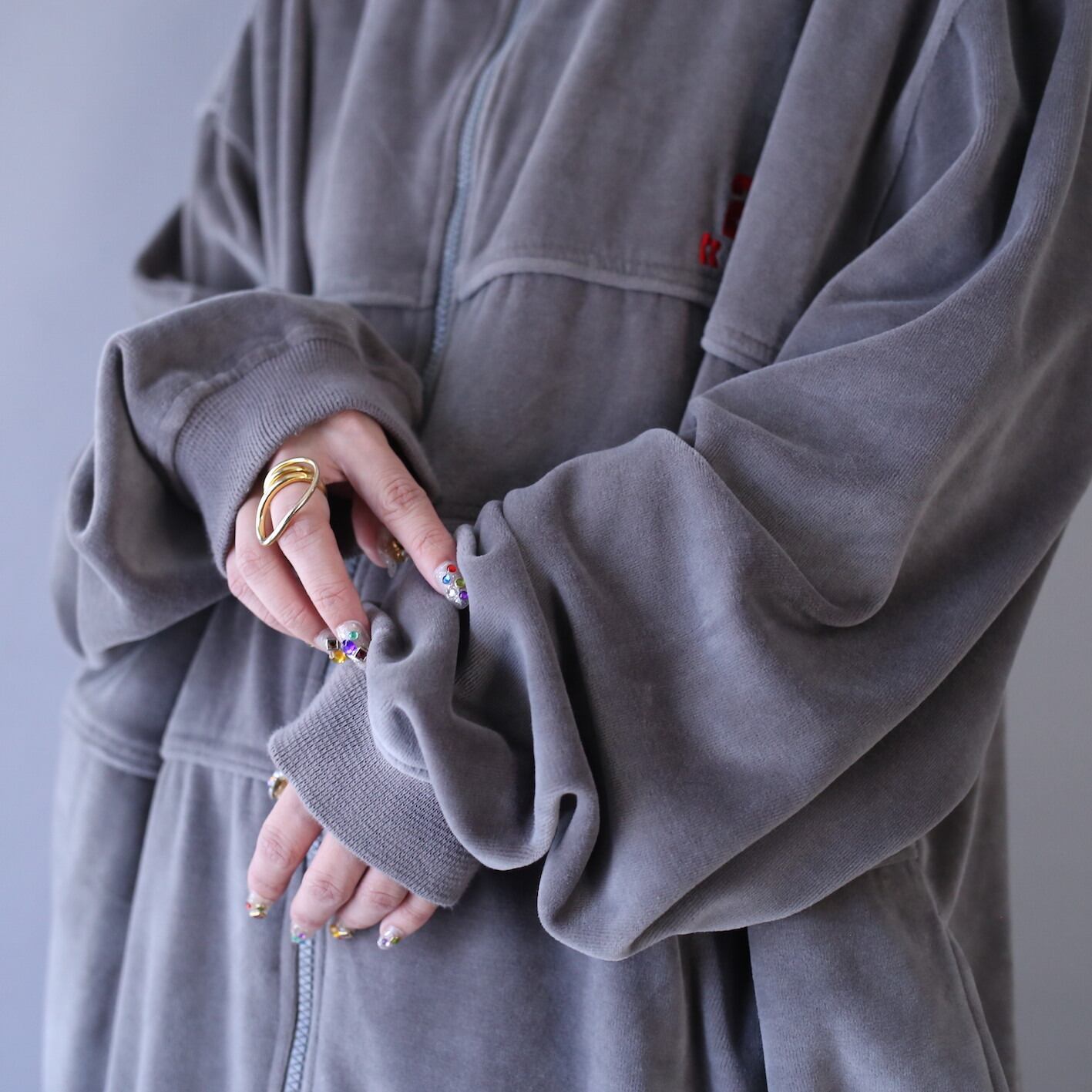 これだけ大きいとインナーで着膨れする心配もないですし、フワッと柔らかいベロア生地は保温性◎フルジップは閉めて着ても良し、少し寝かせても良し、羽織り感覚でガバッと羽織っても良し◎