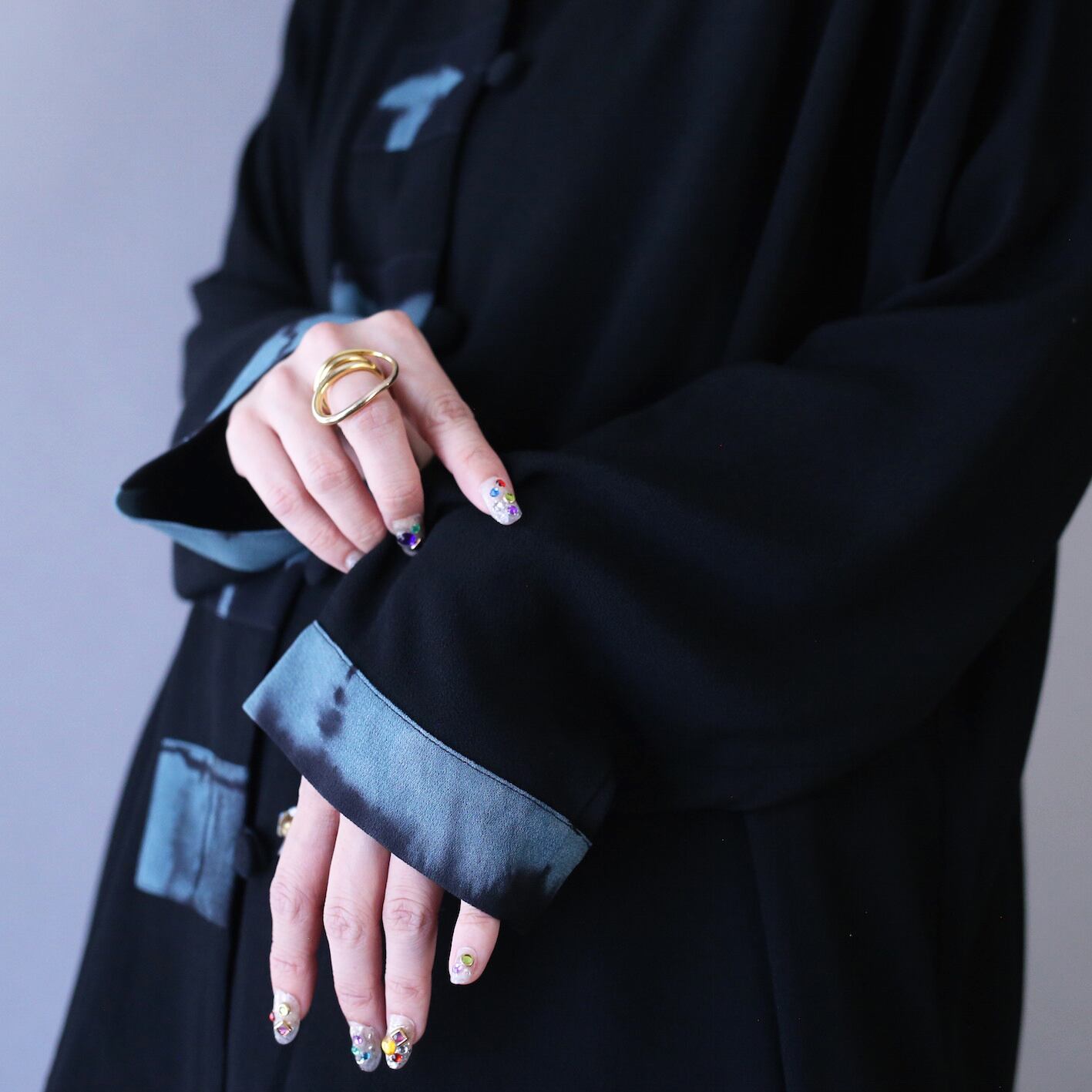 ループボタンにバンドカラーとチャイナチックなシルエット、ボタン部分と袖口、背面には抽象的なパッチワーク、さらにシボ感のある生地が個性的な世界観を爆発させたモード映え間違いなしの1枚をご紹介。