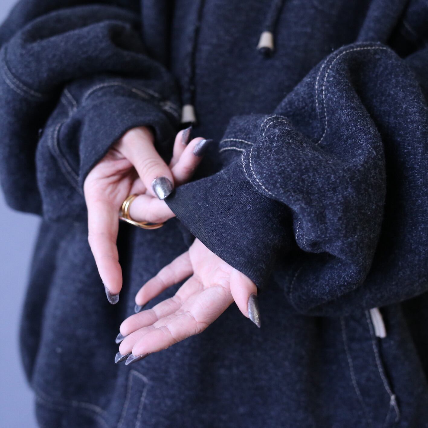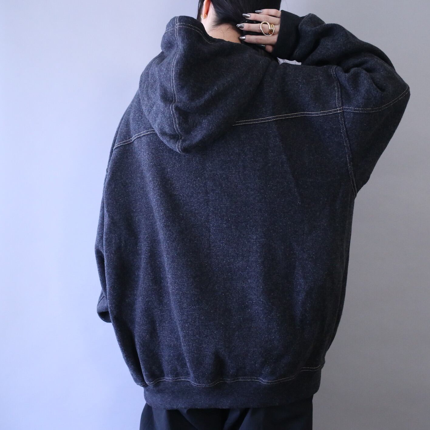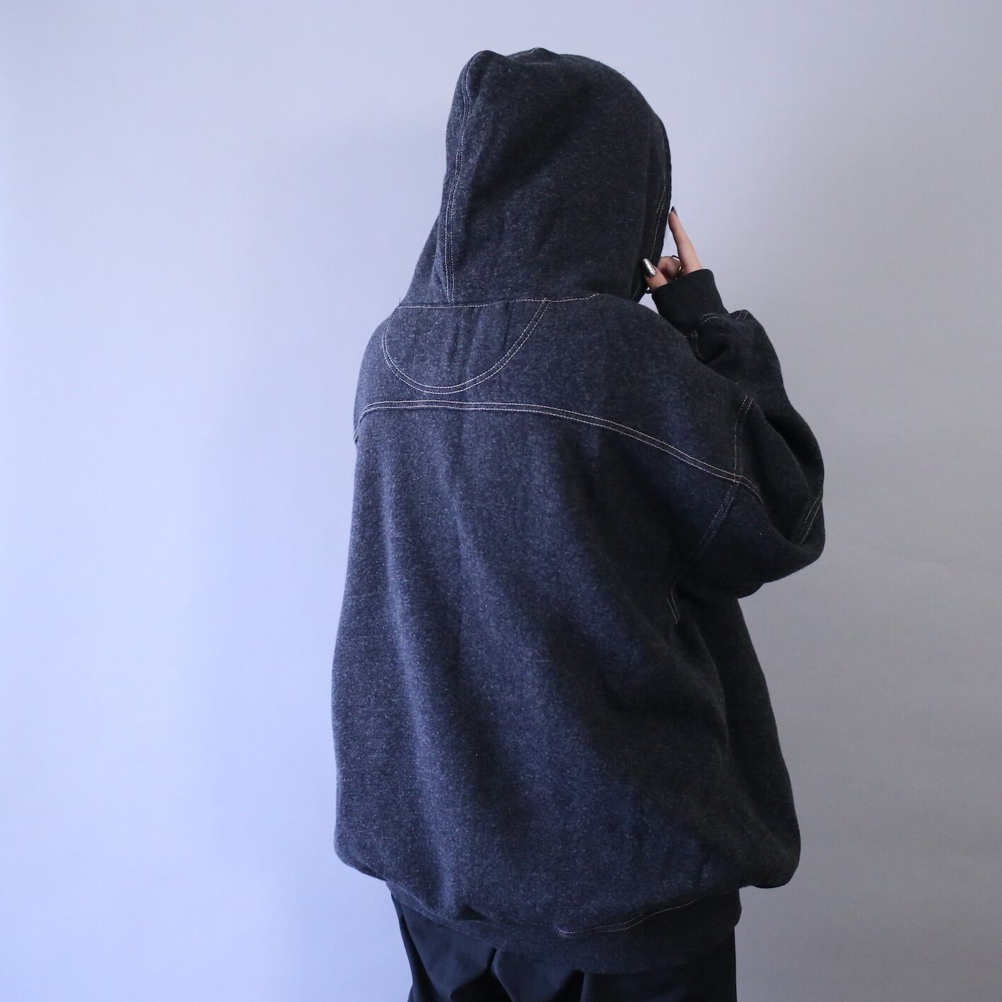 そしてサイズはメンズ2XL相当のオーバーサイズ、着丈と身幅が全く同じ(73cm)と美しいボックスシルエットにアームホール極太、さらにはフードもどっぷり深くこのオーバーなサイジングから繰り出される"ダボッと感"はクセになること間違いなし◎