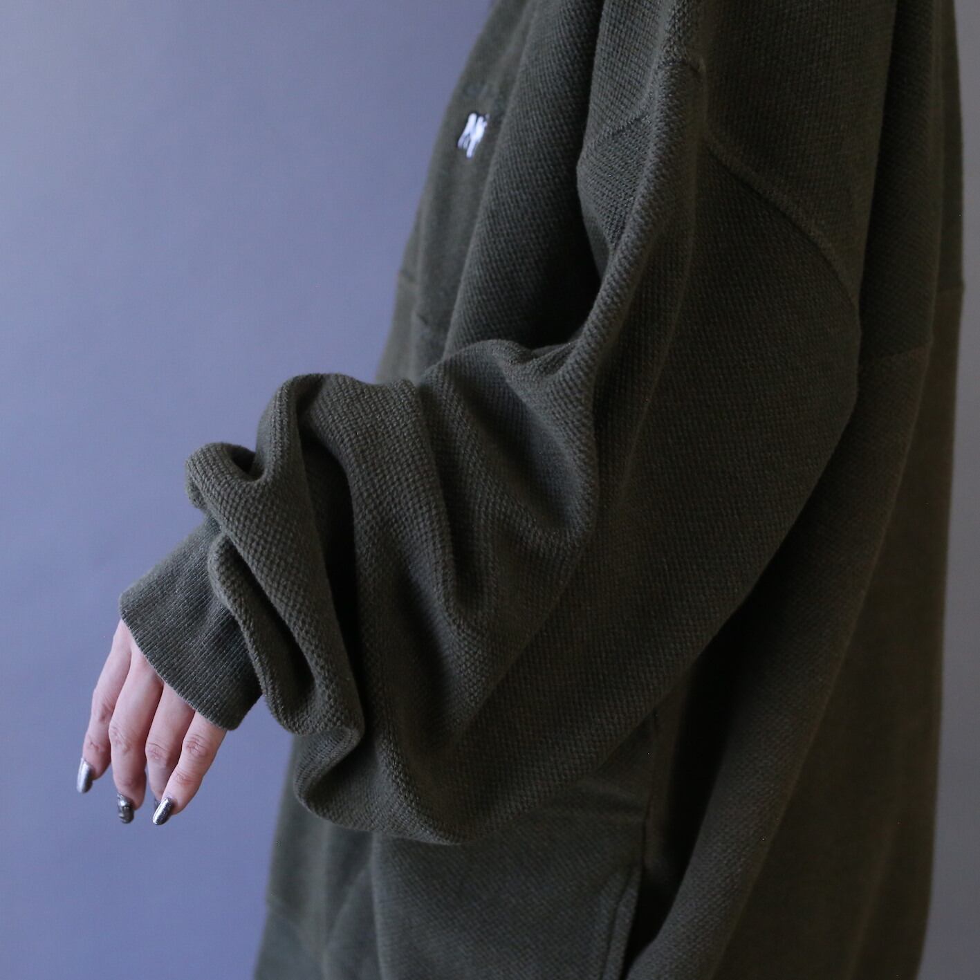 ただオーバーサイズというだけでなく着丈に対して身幅たっぷりのワイドシルエット、横に長く作られているので被った際の"ガバッと感"がバツグン、極太アームも最高〜にツボ