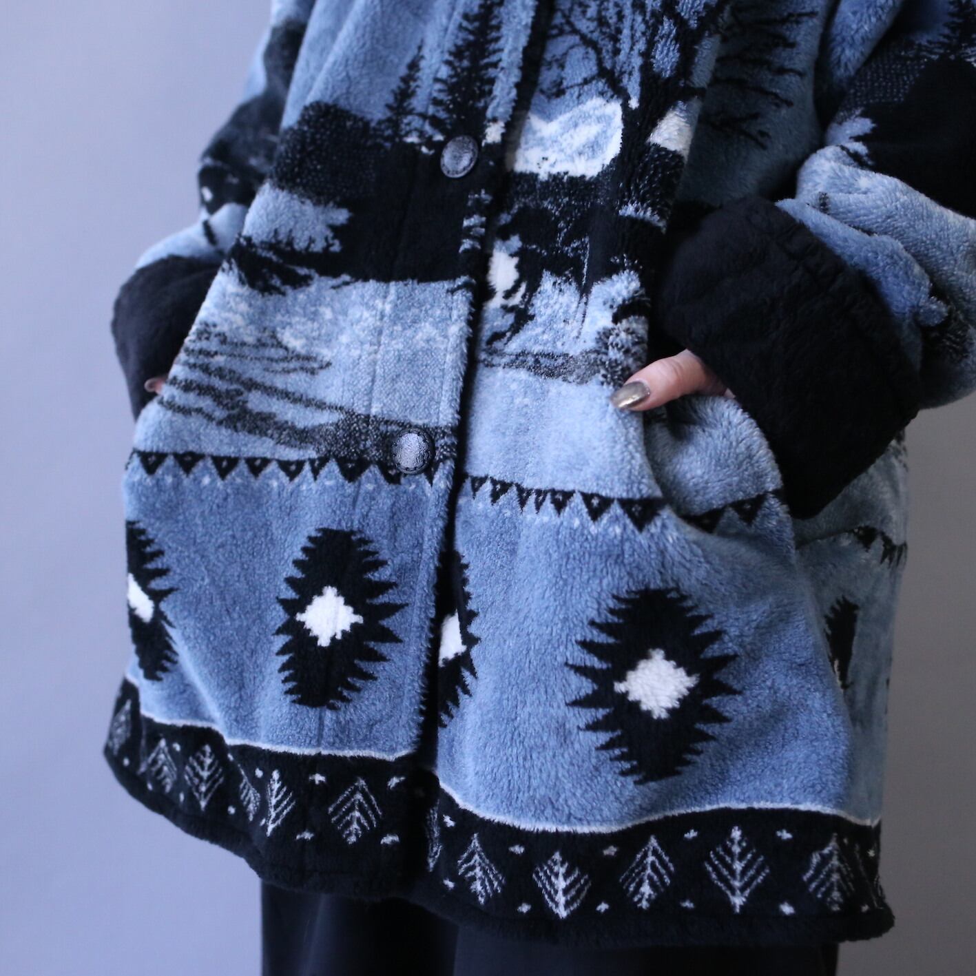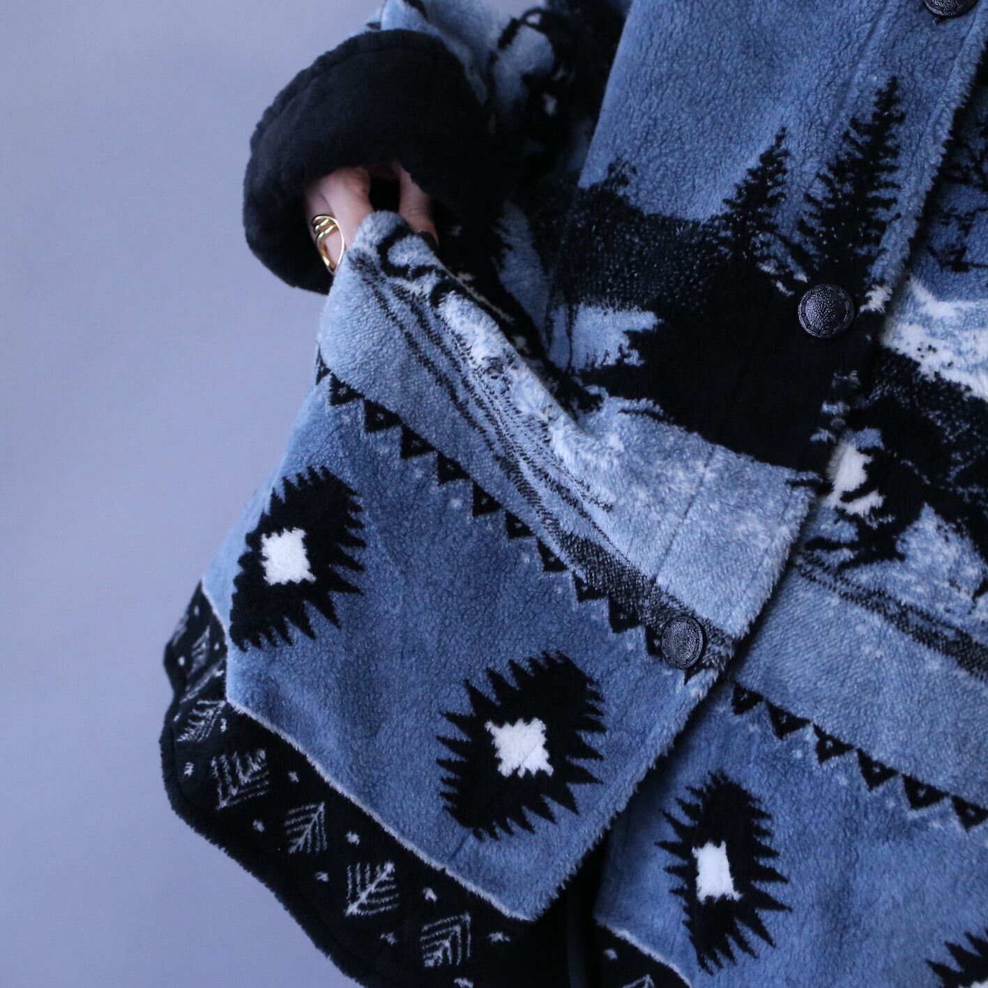 ”白×青×黒”の冬らしい配色、超デカいブラックボタンにフリースのフワフワとした質感が相まって可愛らしさ全開の仕上がり◎