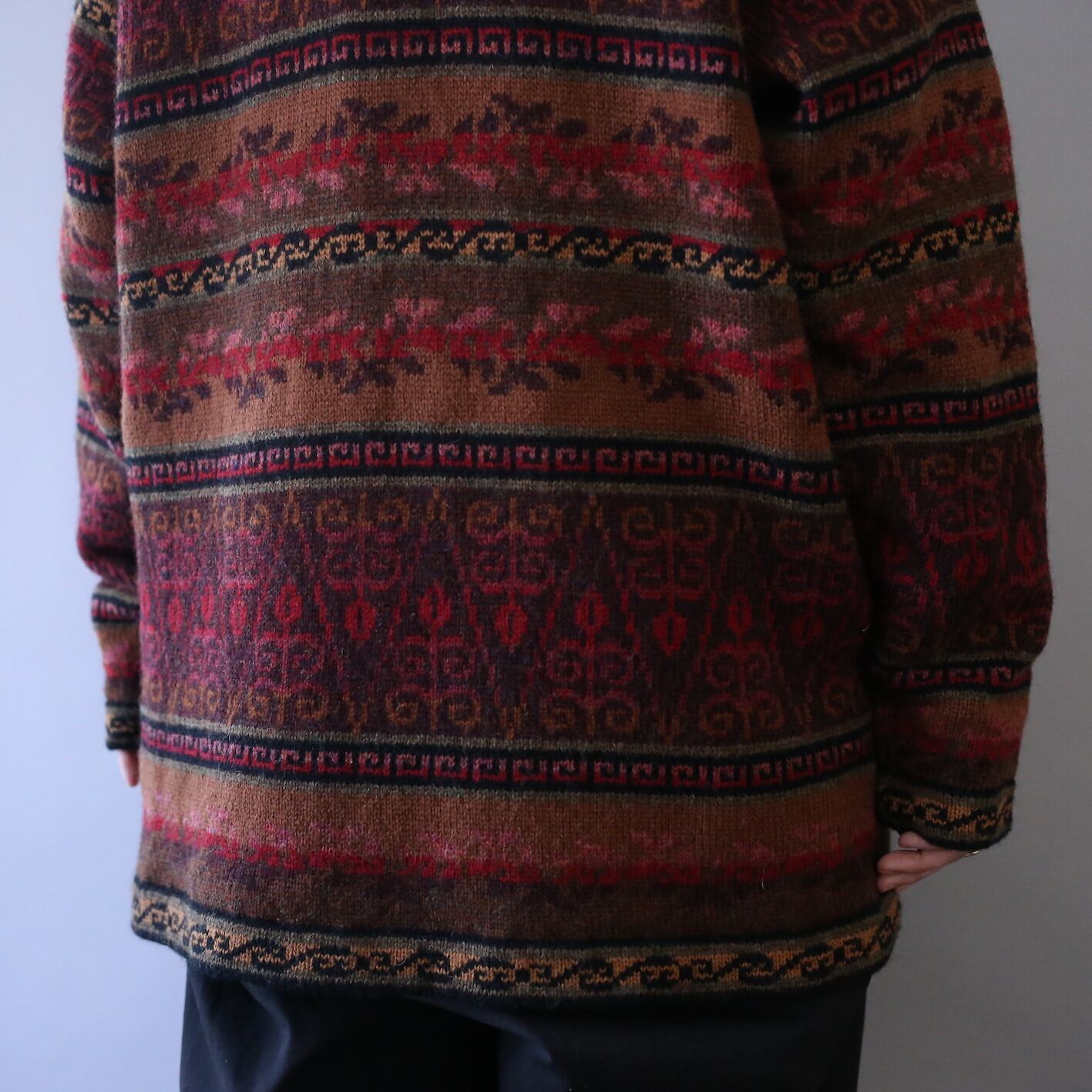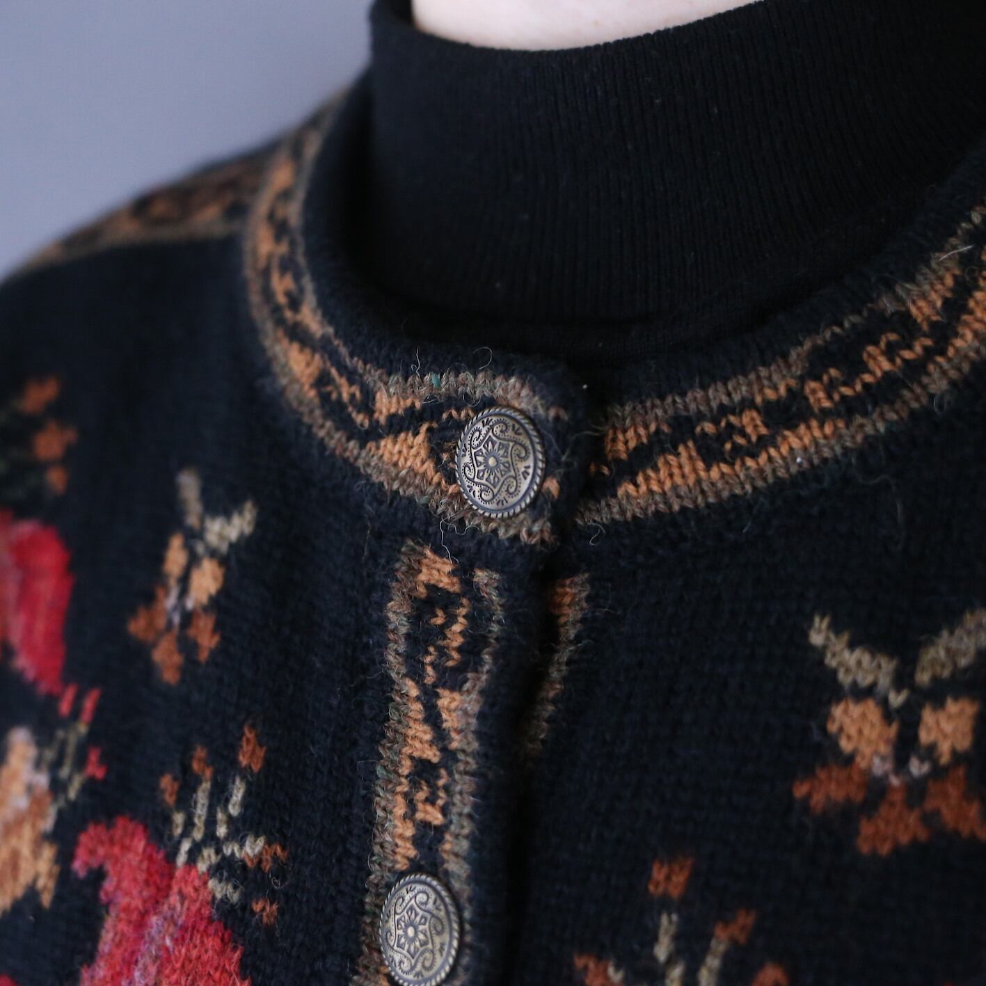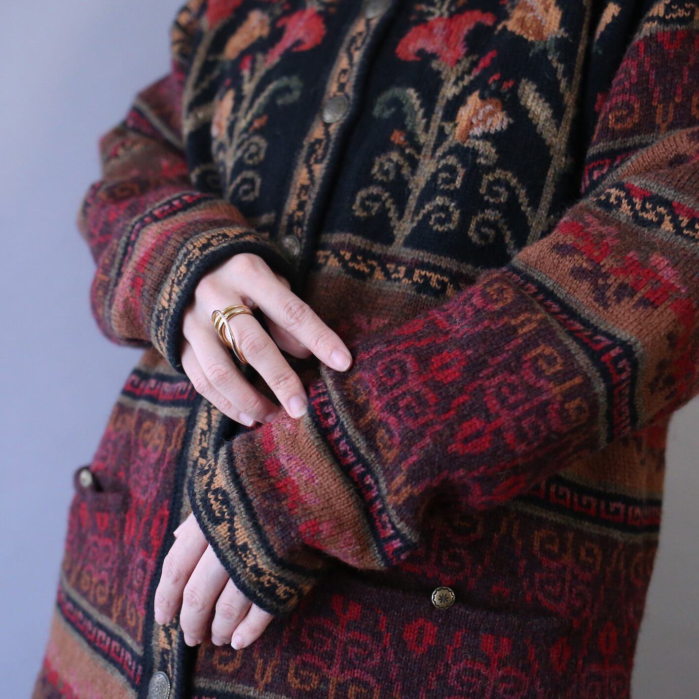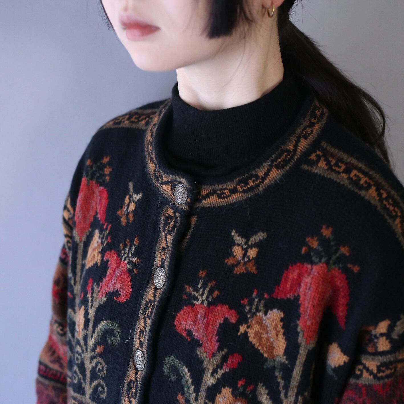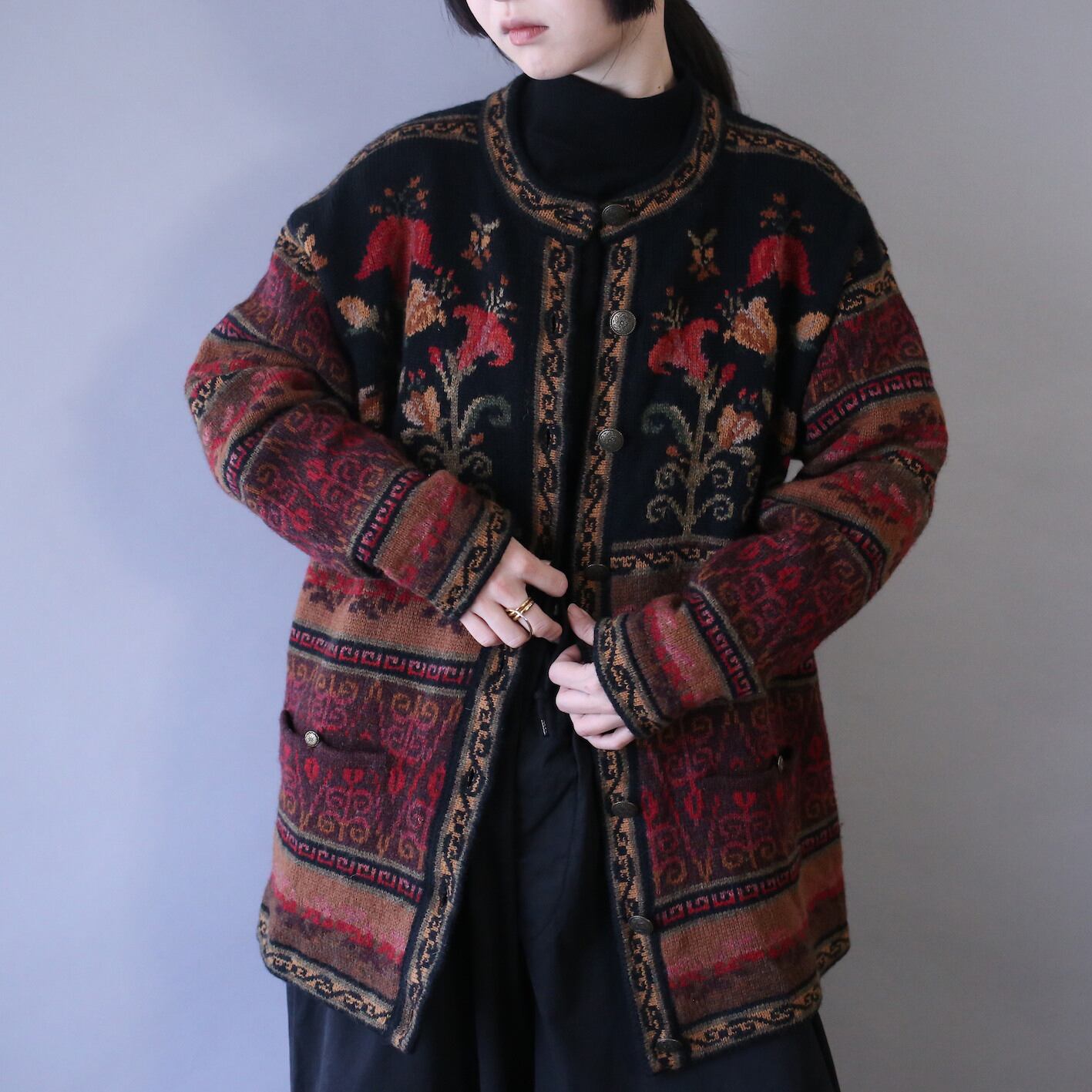 秋冬らしく温かみのある配色で花をモチーフとしたアート感溢れる幾何学模様を施したニットジャケット。