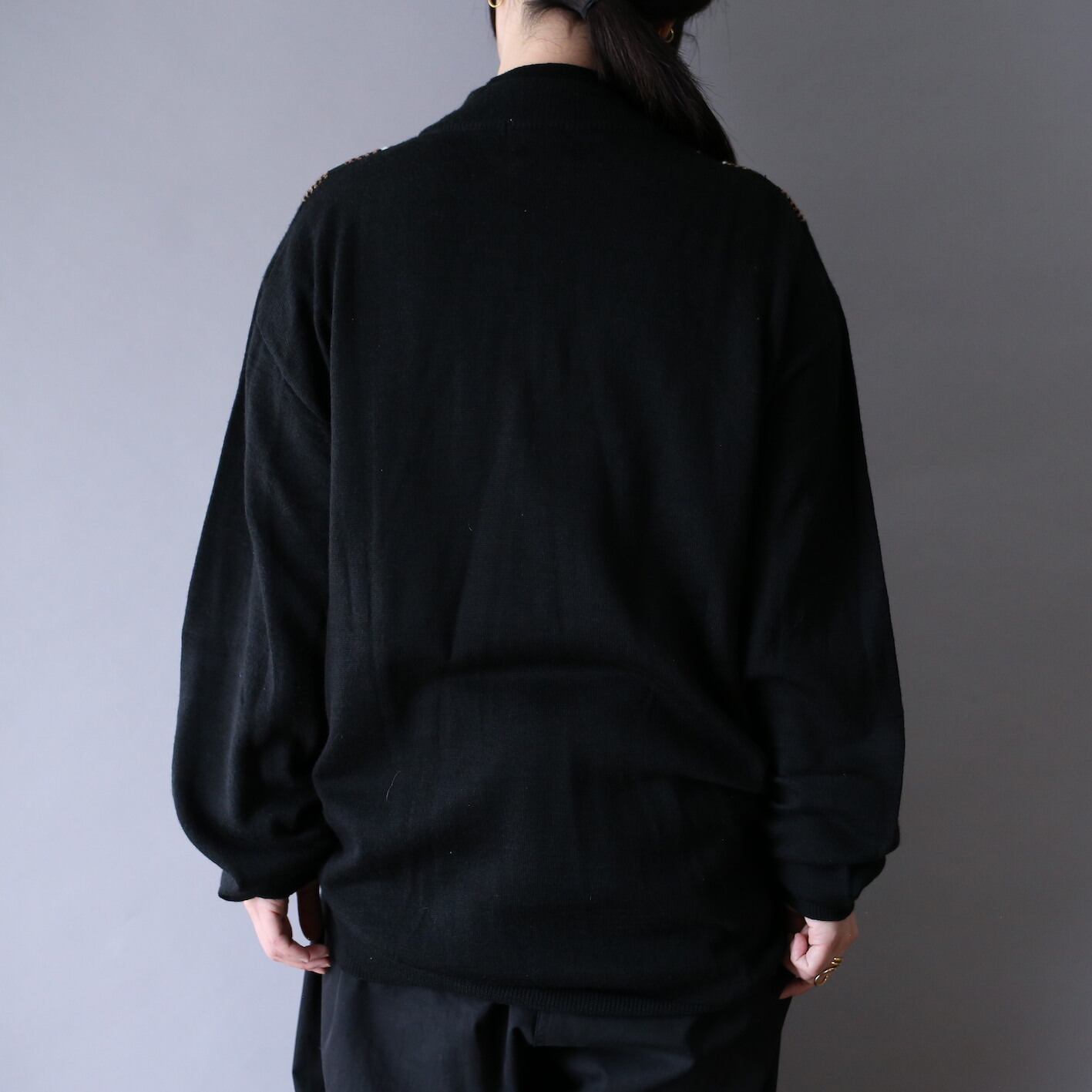 今回のキモとなるのが前身頃に重ねられた”フェイクレザー”の4本ライン。ゆったりとしたニットとヴィンテージ感のあるフェイクレザーの粋な組み合わせが唯一無二の個性を発揮◎