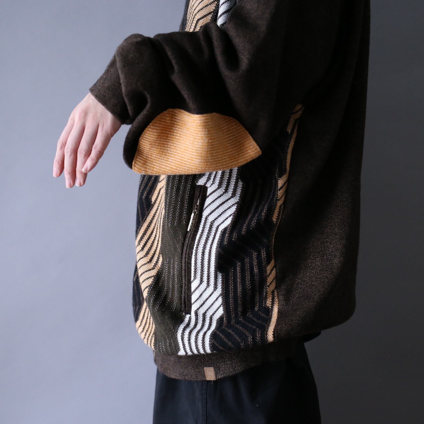 秋冬のオシャレに欠かせないアイテム”パターンニット”よりなんとハーフジップではなく”フルジップ”、”スクエアスタッズ”をジップに添わせ古着の醍醐味である”唯一無二感”をムンムンに漂わせる珍品お持ちしました。