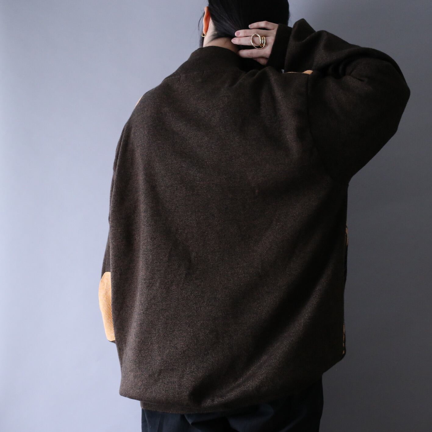 ベースはミックス感のあるブラウンカラーのメランジニット、前身頃には”だまし絵”のようなパターンをドン、イエローやホワイトのライトな配色も相まって好きな人にはとことん刺さる”サイバーテイスト”な仕上がり◎
