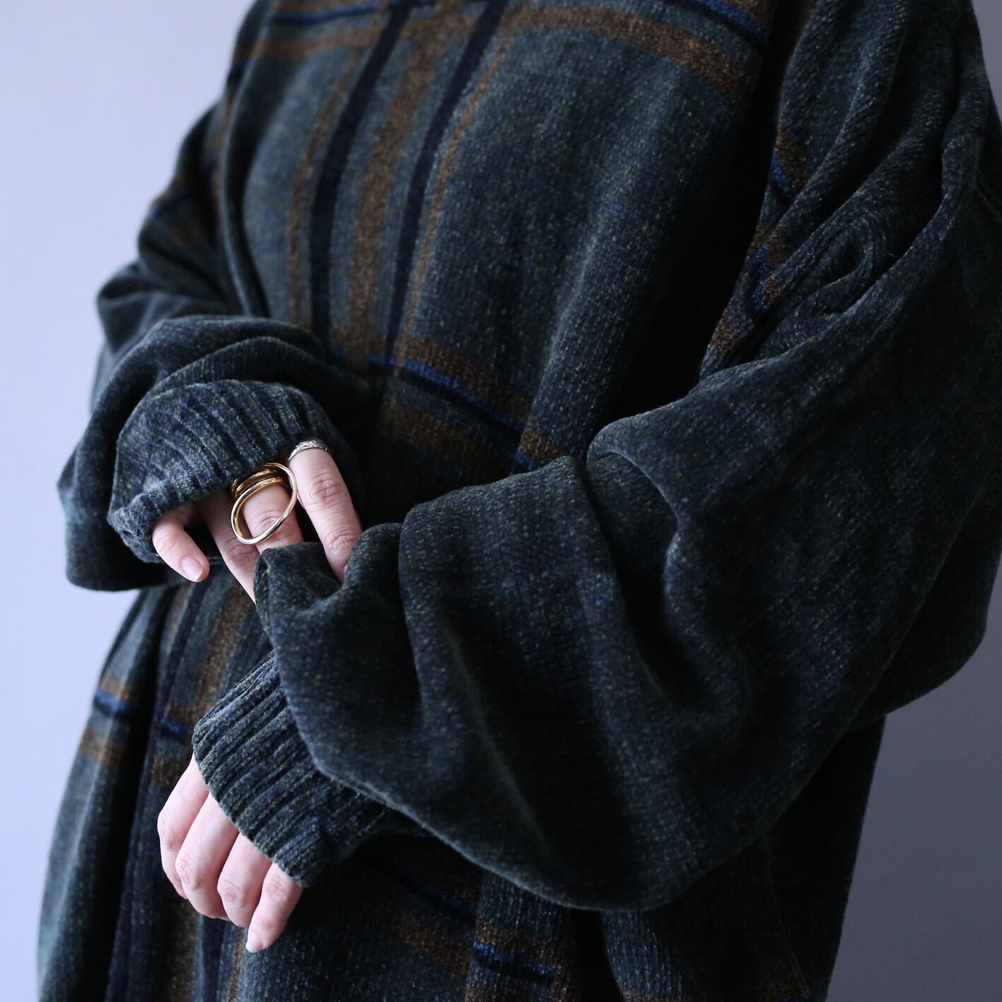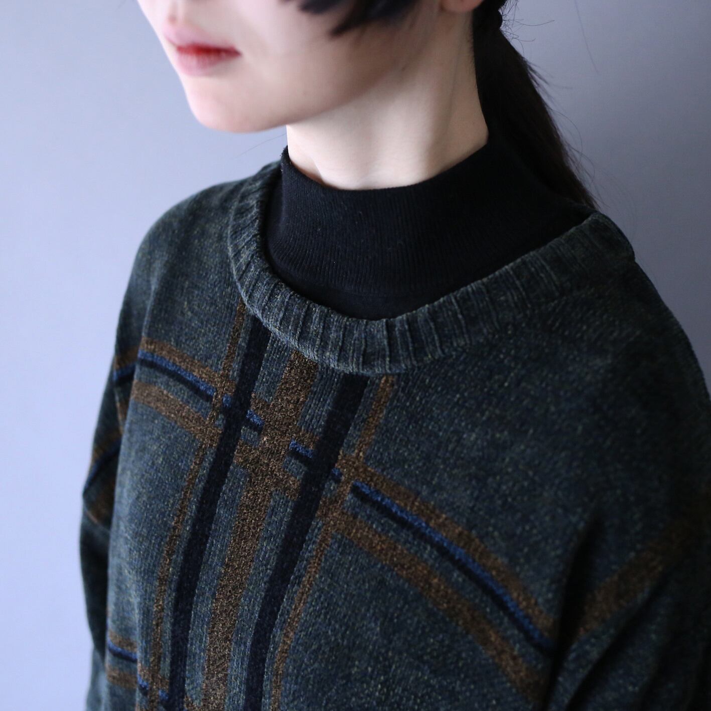 ベースは濃厚な”スモーキーグリーン”、前身頃のクロスデザインはブラウン×ブラックとダークな色味で大人ムード全開。隙間に差し込まれた”青”がアクセントとなりいい〜味出してます◎