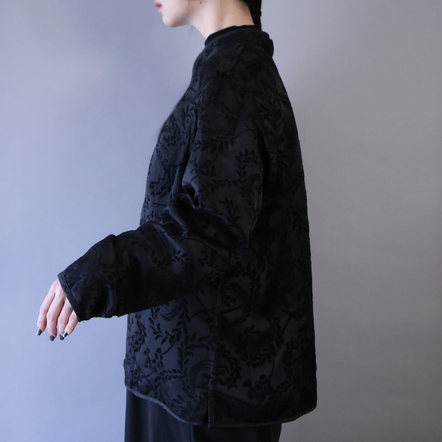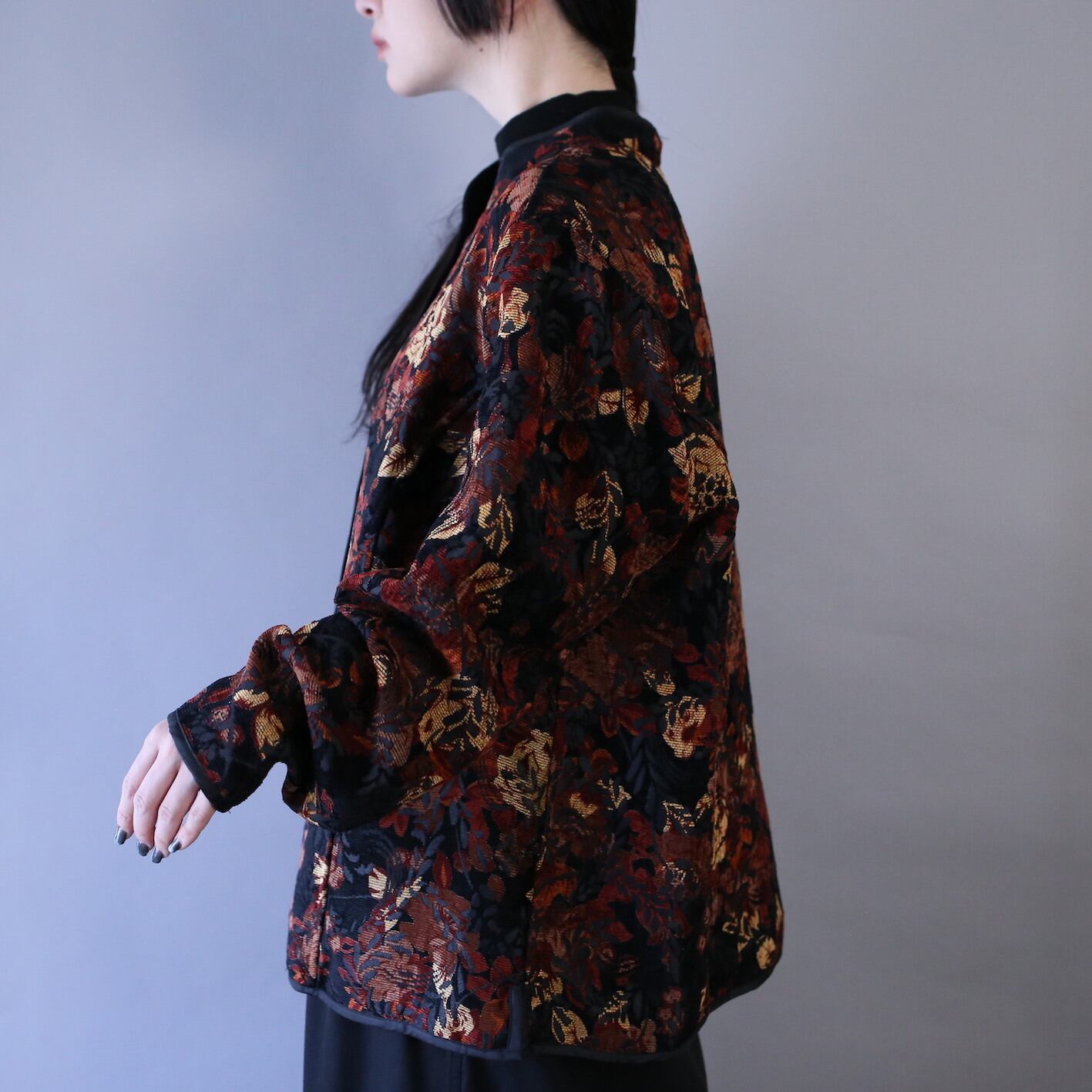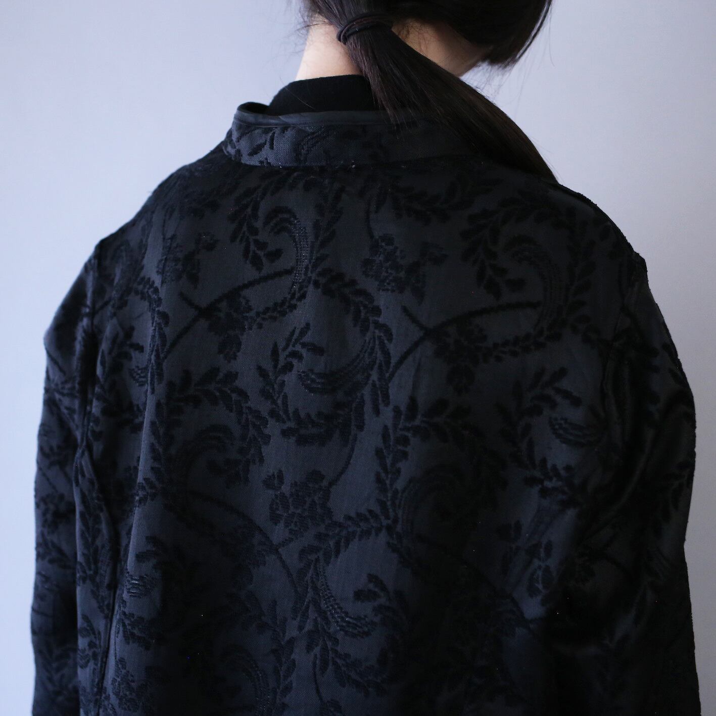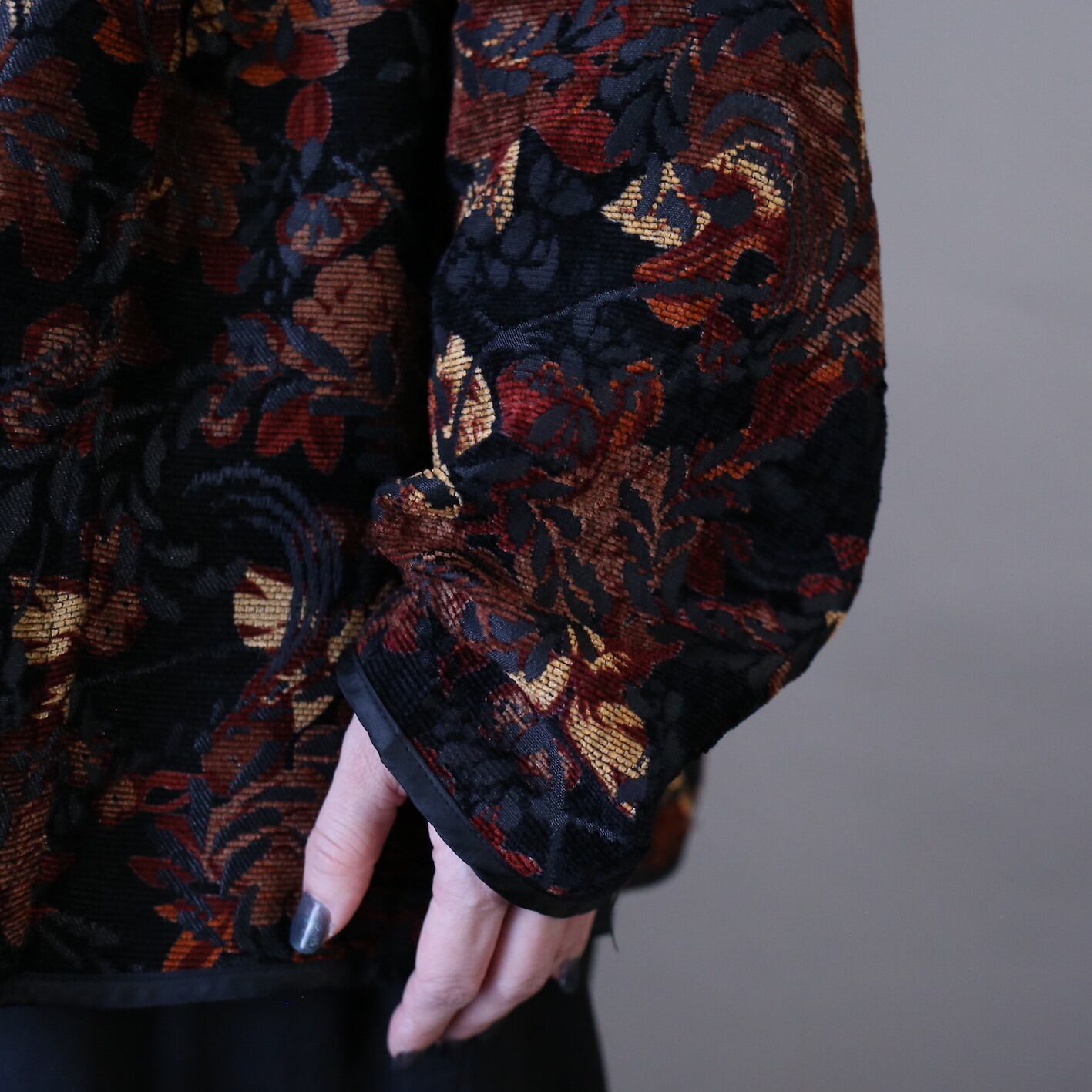 片面はブラックボディにオレンジ系の草花柄×ジャガード織りが角度によって光を反射し光沢で個性を発揮、柄の見事な完成度からラグジュアリーな世界観を放つ"唯一無二"な仕上がりに。