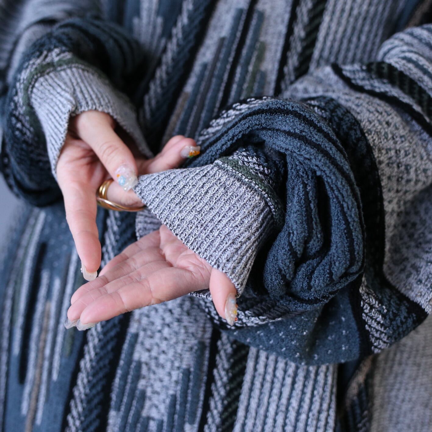 ベースカラーはモノトーン、メランジニット独特のノイズの走ったようなミックス感がデザインに深みをプラス。