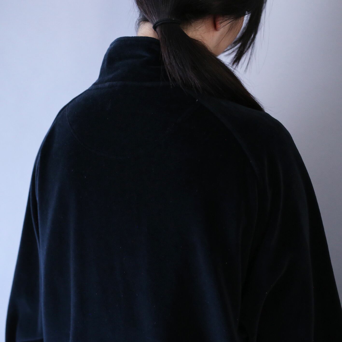 カラーはブラックオンリー、ベロア特有の鈍い光沢感とドレープ性の高さが相まって光の当たる角度によって色の濃淡が生まれラグジュアリーな質感を放ってくれます◎