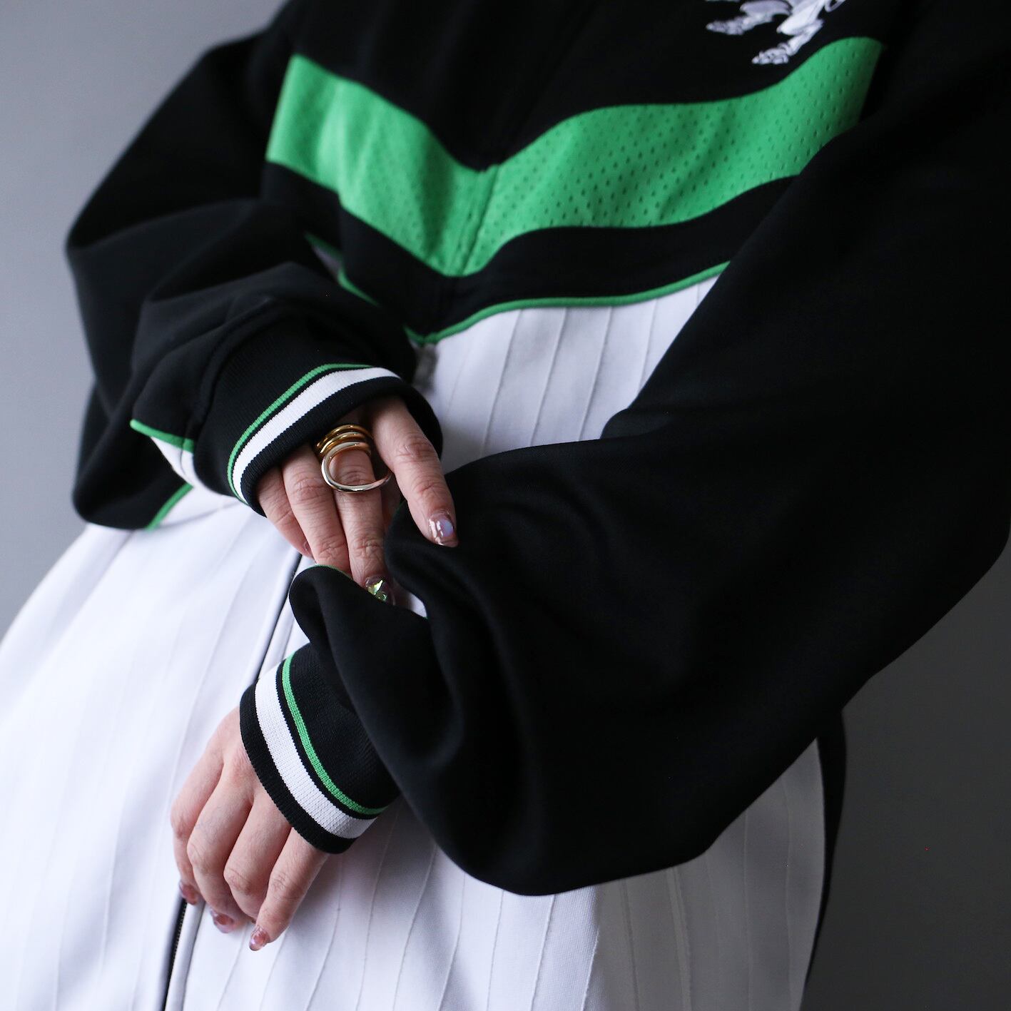 白×黒のバイカラーに蛍光緑の差し色が良い〜アクセント◎ 両袖からフロントを通って真っ直ぐに引かれたパイピングやメッシュ生地の切り替えなど嬉しいポイント盛り沢山◎