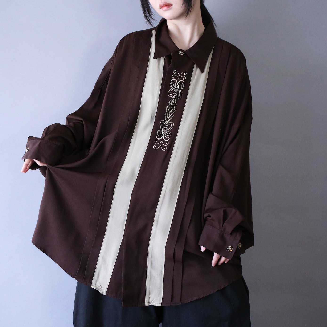 フロントボタンを前立てで覆い隠した”比翼仕立て”、比翼部分は帯のように太く作られそこに幾何学的なデカ刺繍をドン。