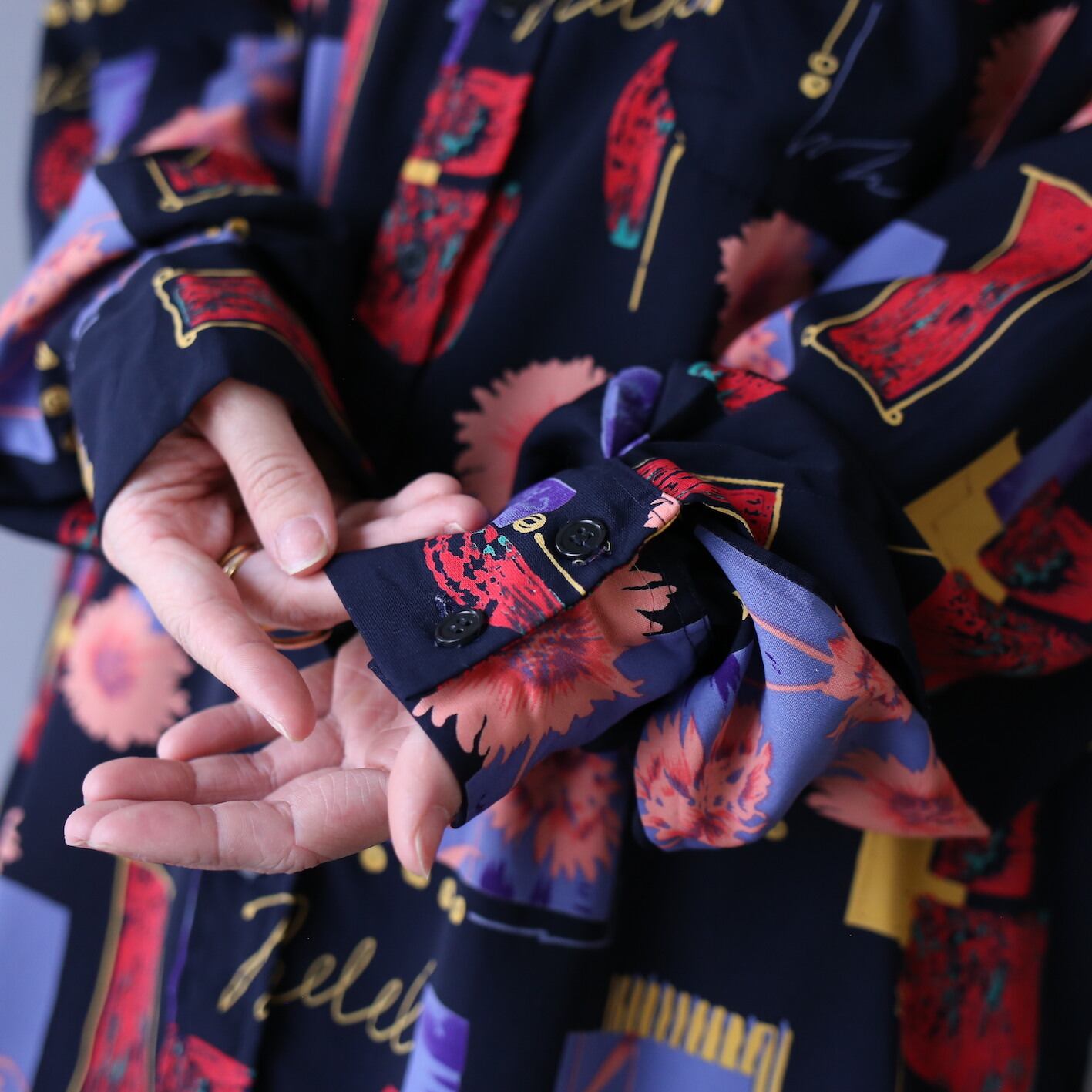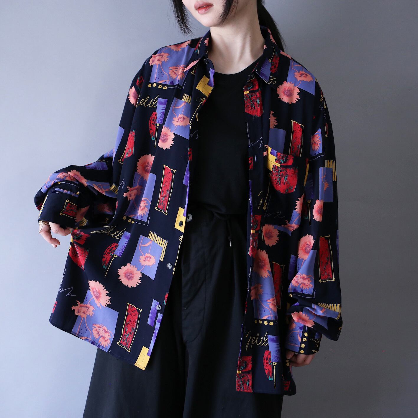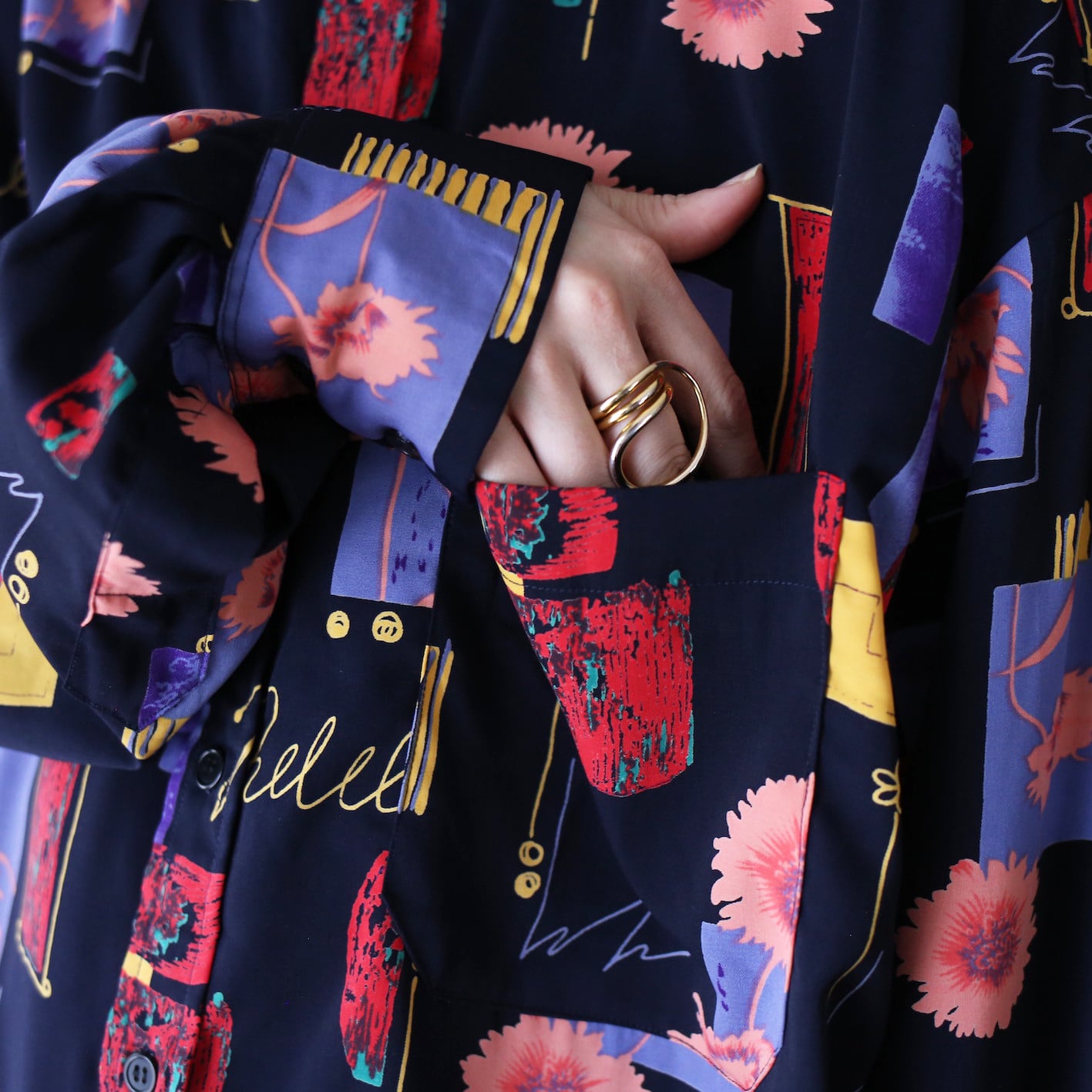 総柄ですがライトな色味とハリ感のある素材の合わせが非常に良いので重くなりすぎず意外と合わせやすいです、良い意味で古着らしくなく1枚で見応えを作ってくれる嗜好の逸品です〜