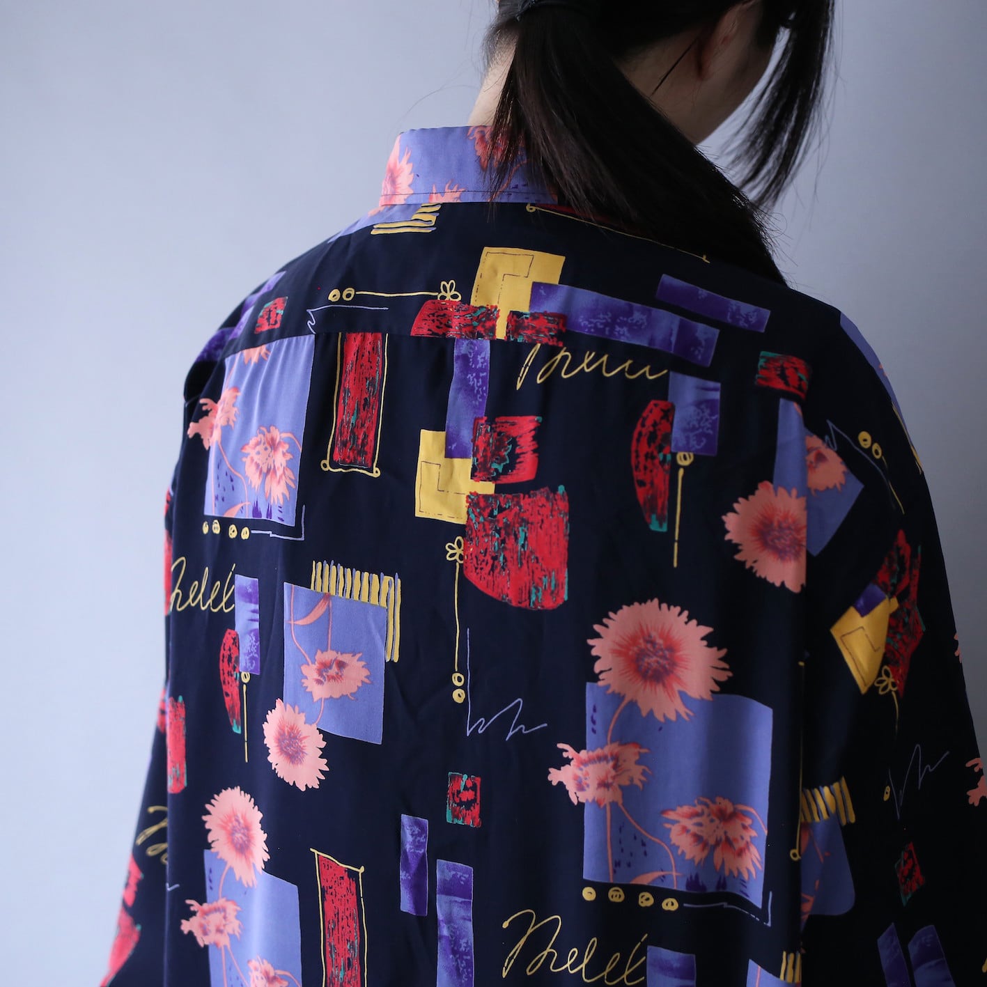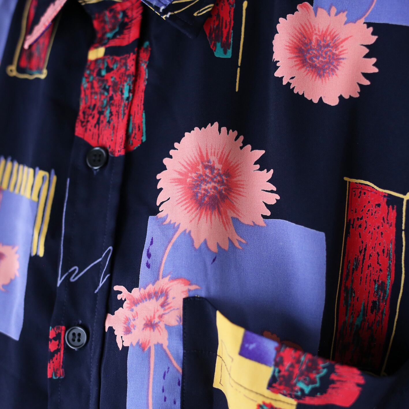 一面はパステルカラーの爽やかな花柄、二面は萎れた花や毒々しいタッチで感情的に描かれた抽象柄。相反する2つの柄の相乗効果がシンプルにダークな柄シャツよりも”混沌”とした世界観を発揮した”唯一無二”なデザイン。