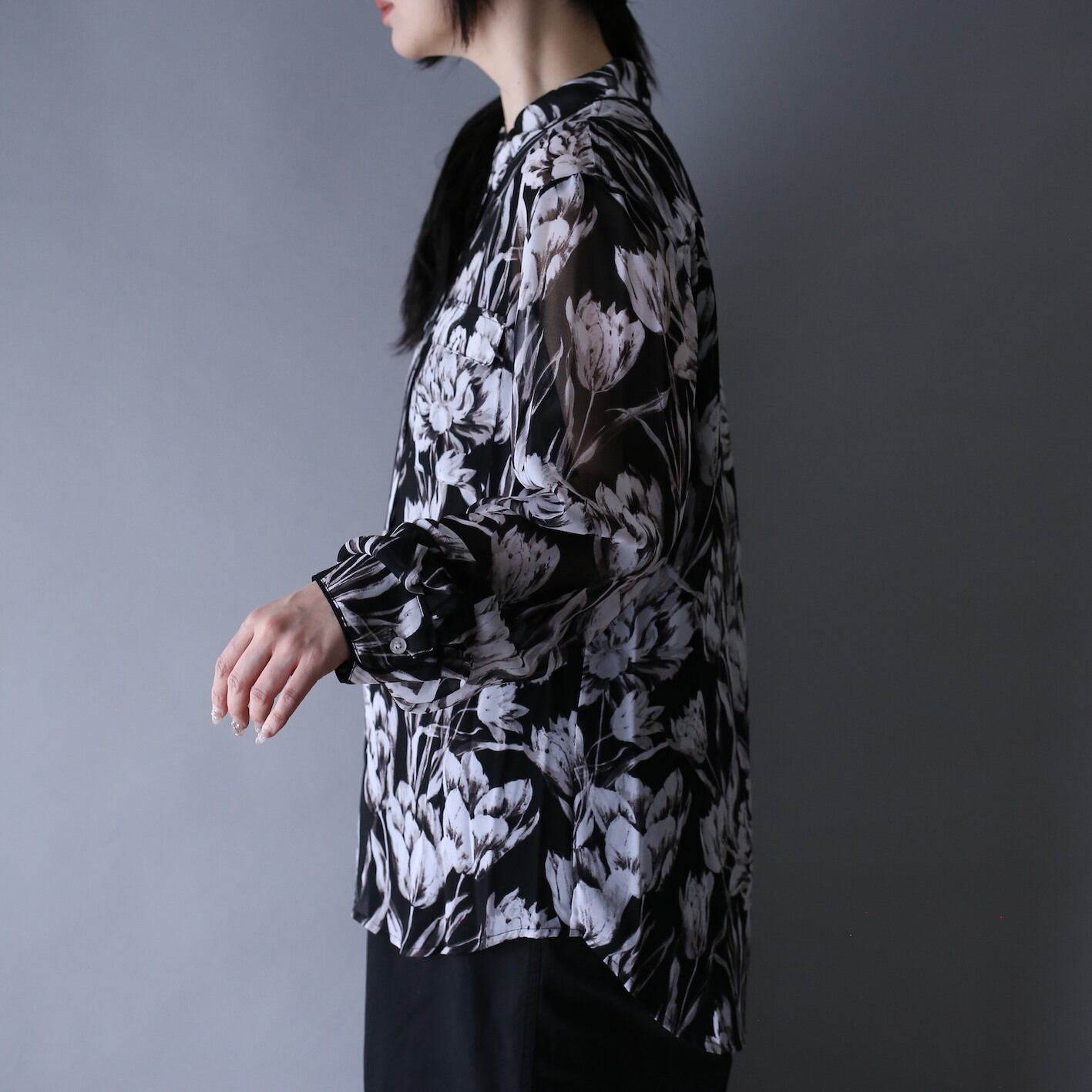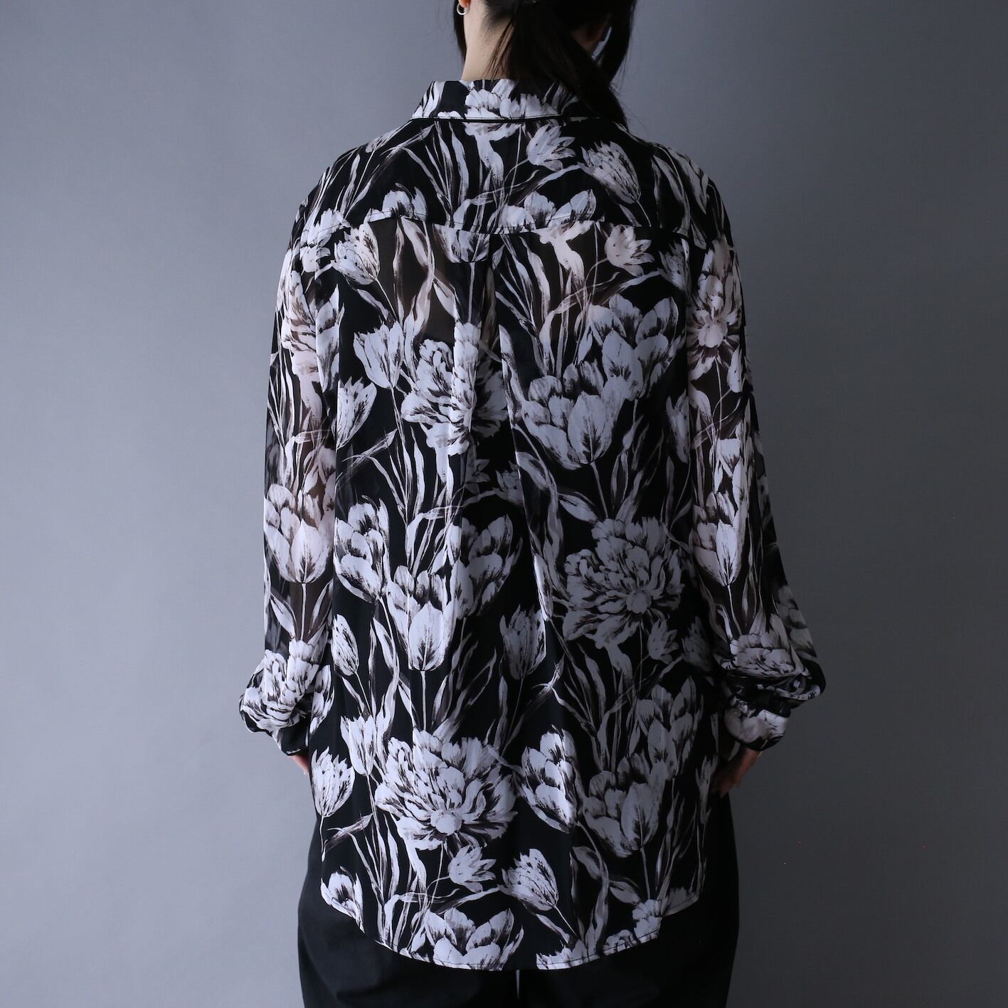 繊細に描かれた美しい”花柄”に襟や袖を縁取る立体的な”パイピング”、加えてほんのり透けるシアー生地が妖艶さを加速させる極上シースルーシャツの入荷です。