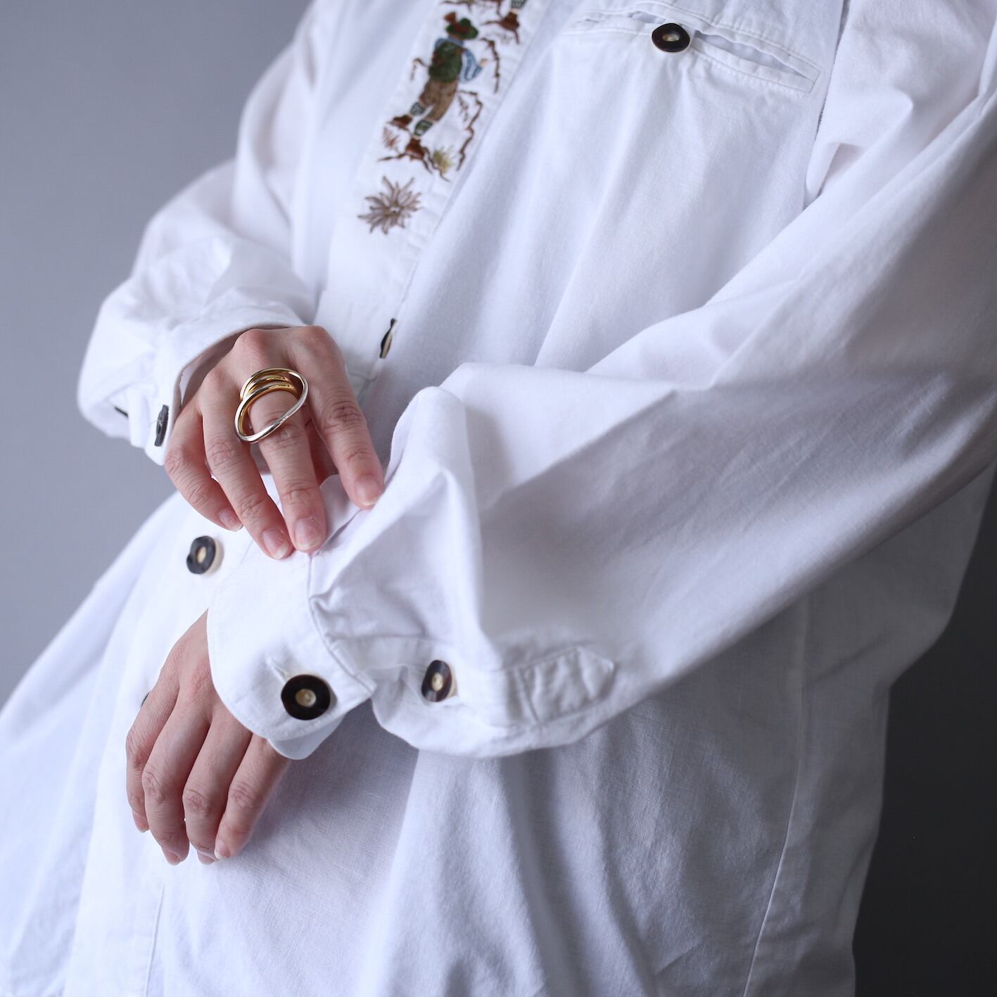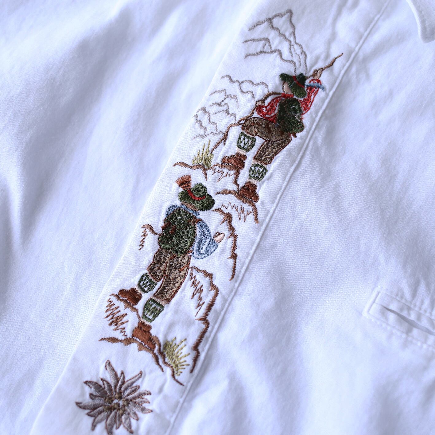 フロントボタンを一部前立てで覆った半比翼仕立て、その上には冒頭で述べたチロリアンらしい刺繍を贅沢にオン、刺繍の下にはアクセントとなるバンドを加えることで服に一層の深みをプラス。