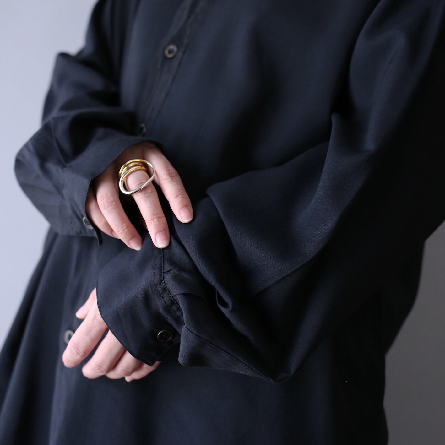 服を纏う漆黒の黒、レーヨン×ポリエステルの鈍い艶感を帯びた上質な生地と相まってシックでモードな世界観を演出◎