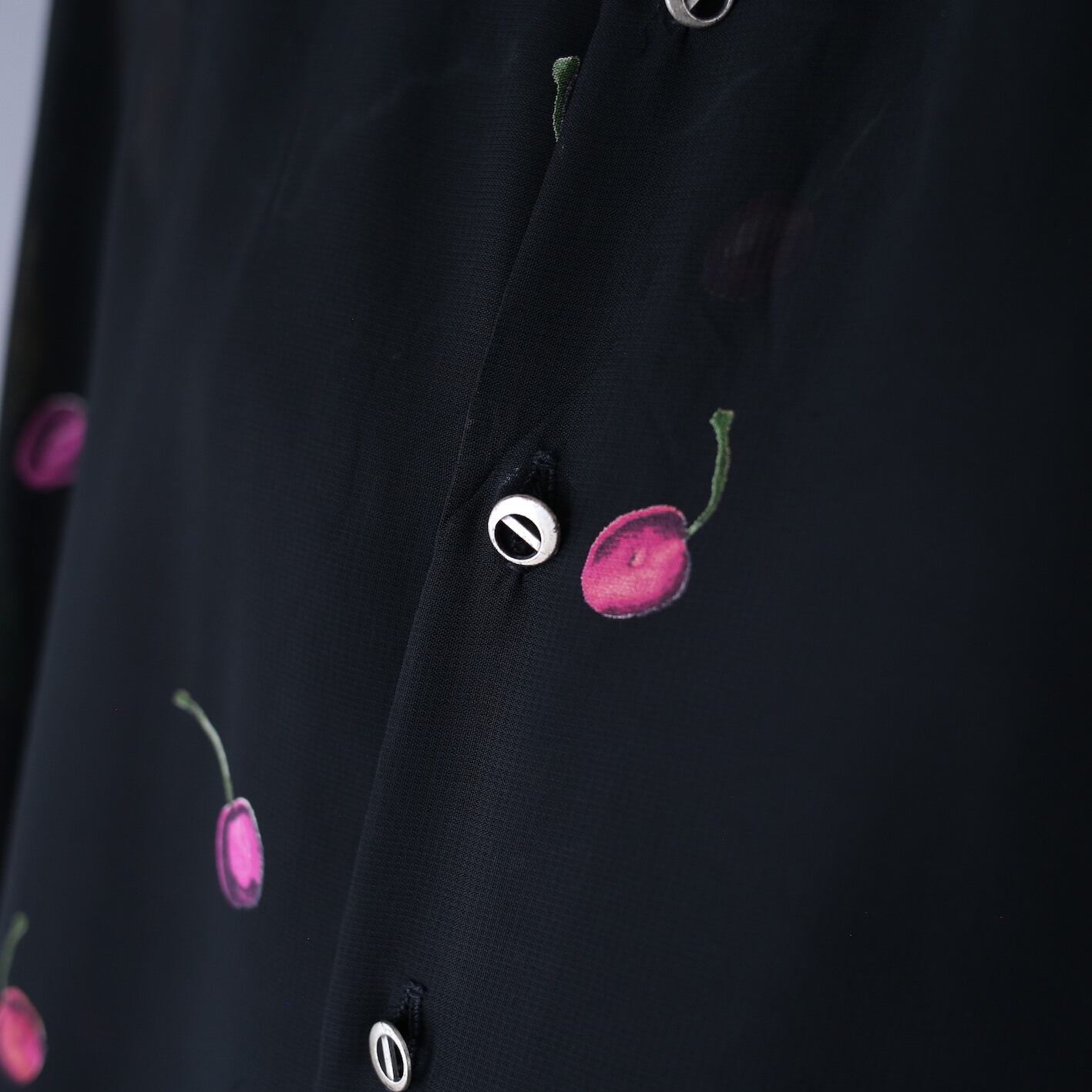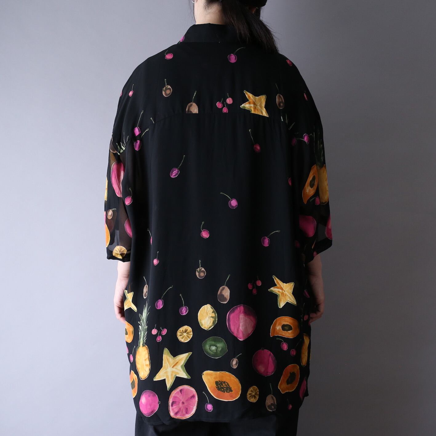 黒ベースに瑞々しいフルーツをゴロゴロと散りばめ”ポップ×モード”な世界観を放つシアーシャツきました。