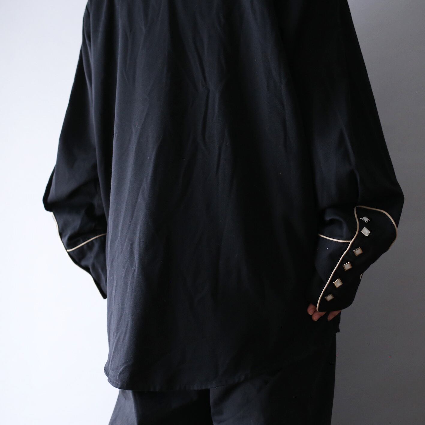 メンズXL表記のゆったりとしたオーバーサイズ、袖もかなり長めに作られルーズな着こなしが堪能可能、生地はしっかりとコシのあるレーヨンポリを使用しマットな光沢がモードな雰囲気を一層加速◎