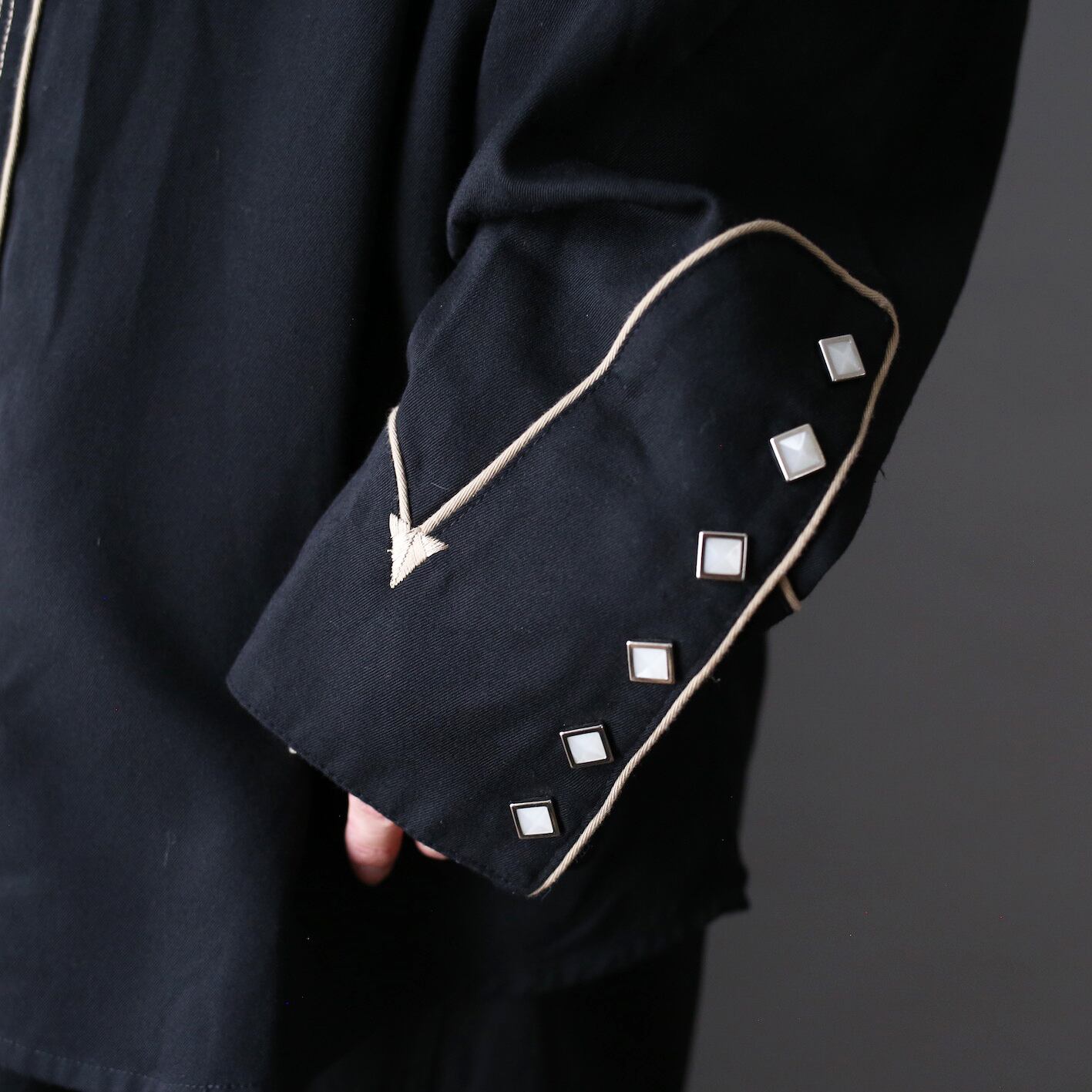今回の目玉であるギター刺繍、”パイピング”で縁どり刺繍で細部まで表現、周りに散りばめられたストーン型のスナップボタンが華やかなアクセントをプラス。