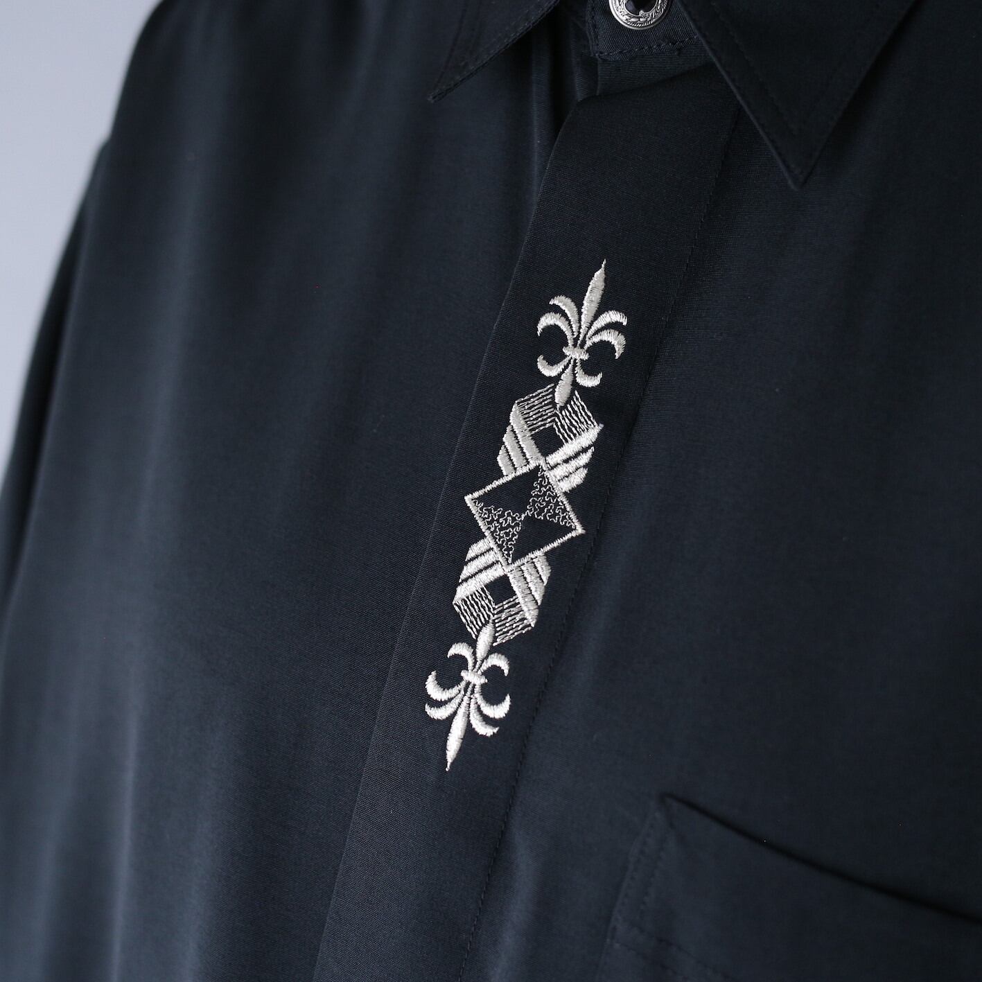 ボタンを前立てで覆い隠した比翼シャツ、前立て部分には貴族チックな刺繍をオン、艶感や立体感がデザインを輝かせワンポイントで良いアクセントに◎