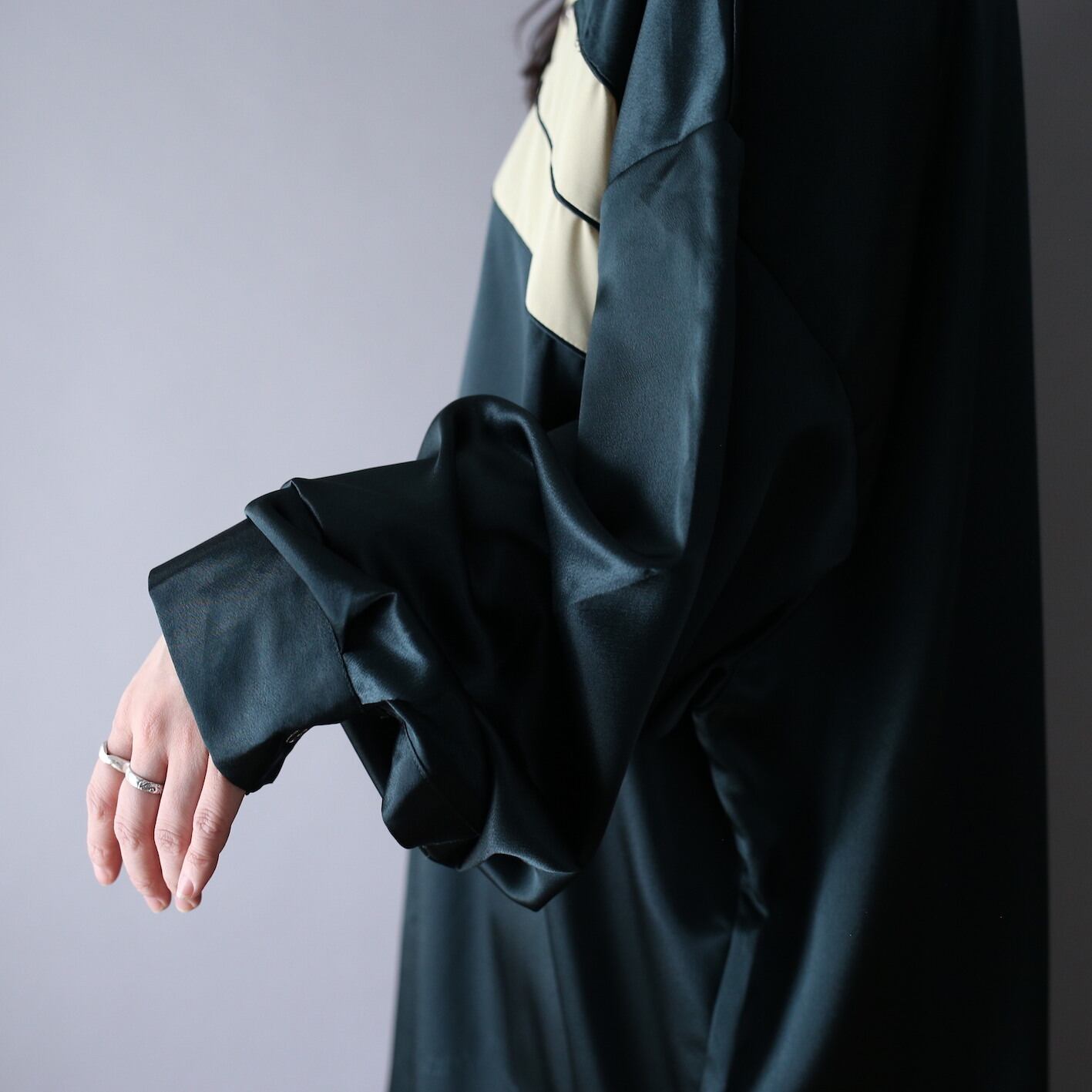 スペシャルなのはデザインだけに留まらず、3XLの超オーバーサイズにアーム極太で身幅もたっぷりワイド、しなやかなドレープが光沢を放ち妖艶な極上シルエットを披露◎