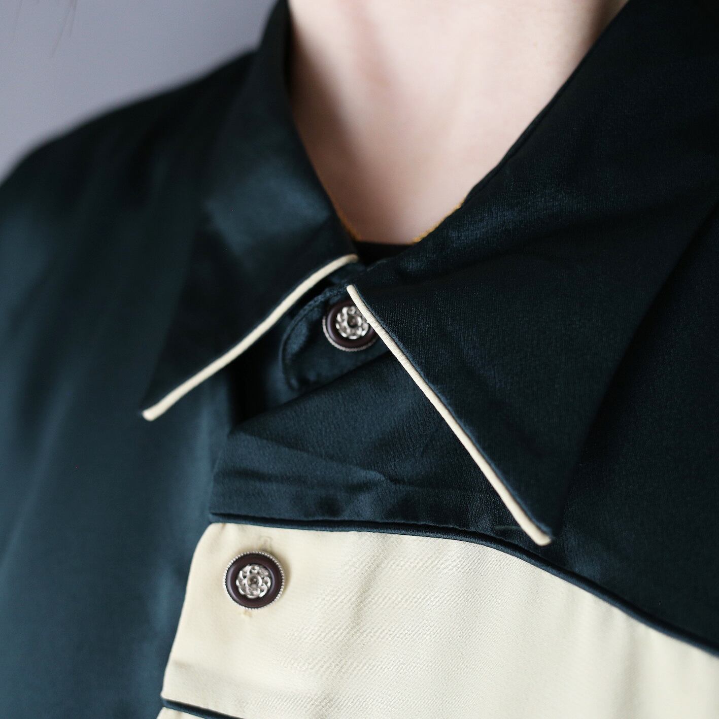 高級感たっぷりのサテン生地にアシンメトリーな切り替え、光り輝くデザインボタン、さらにサイズもバカデカと圧倒的”一点物感”を放つ極上シャツが登場。