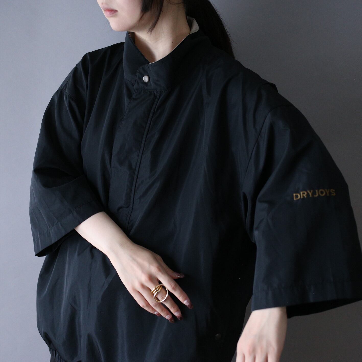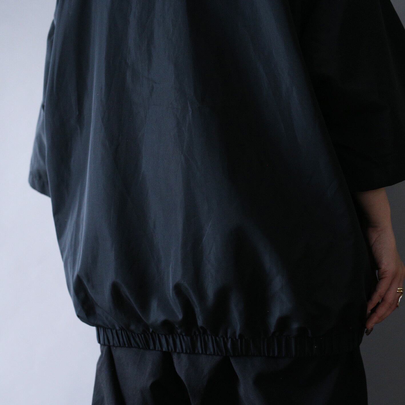テックノリの良いシャカシャカ素材にサイズ表記XLのオーバーサイズ、肘までずっぷりと覆い隠すほどのロングな袖丈にワイドな身幅が裾のリブでポテッと溜まり1度着たら病みつきになる極上シルエット◎