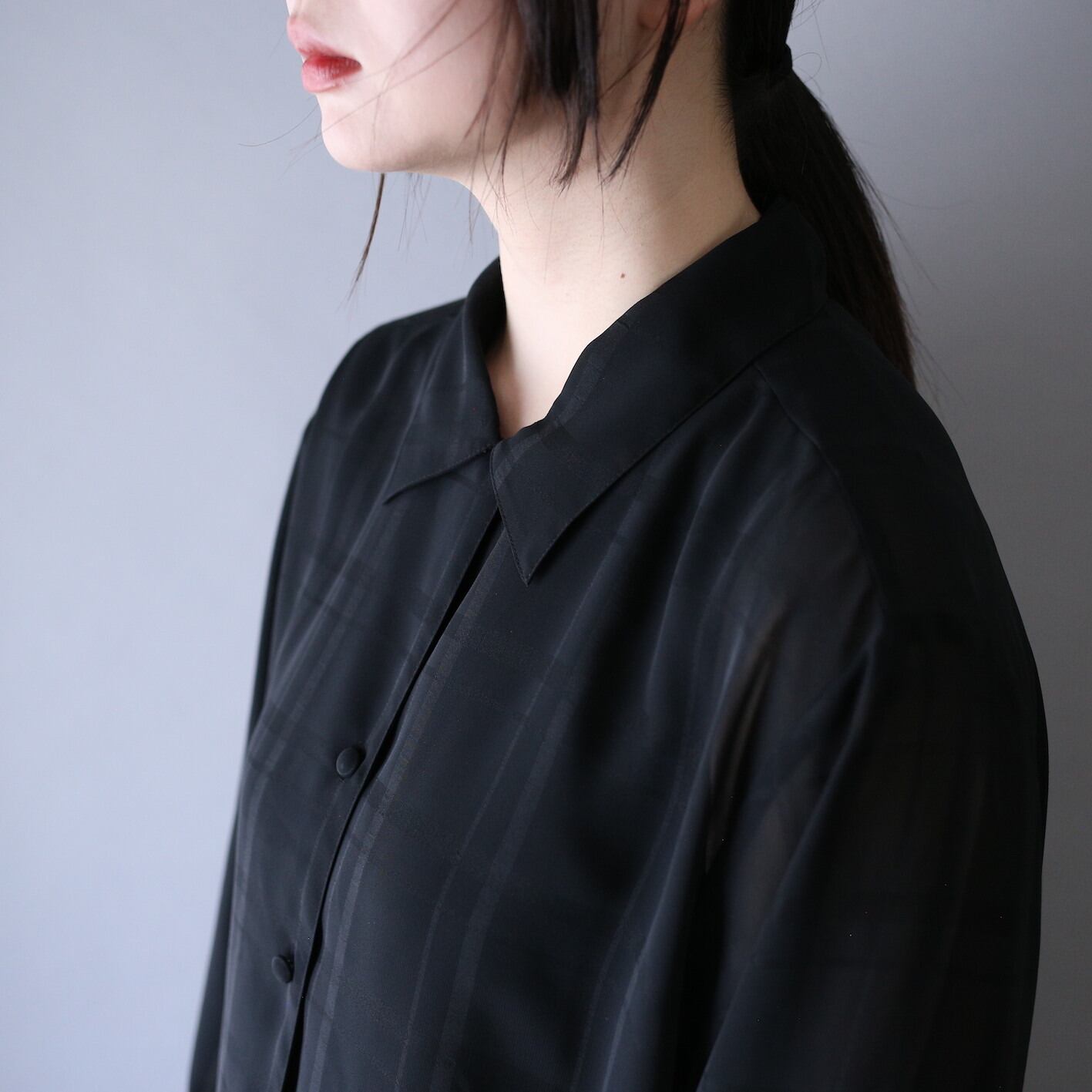 黒単色ですがうっすらと施された格子柄が透け具合を絶妙〜に調整、さらにボディと同じ生地を使ったくるみボタンを使用しモード感をググッと加速。