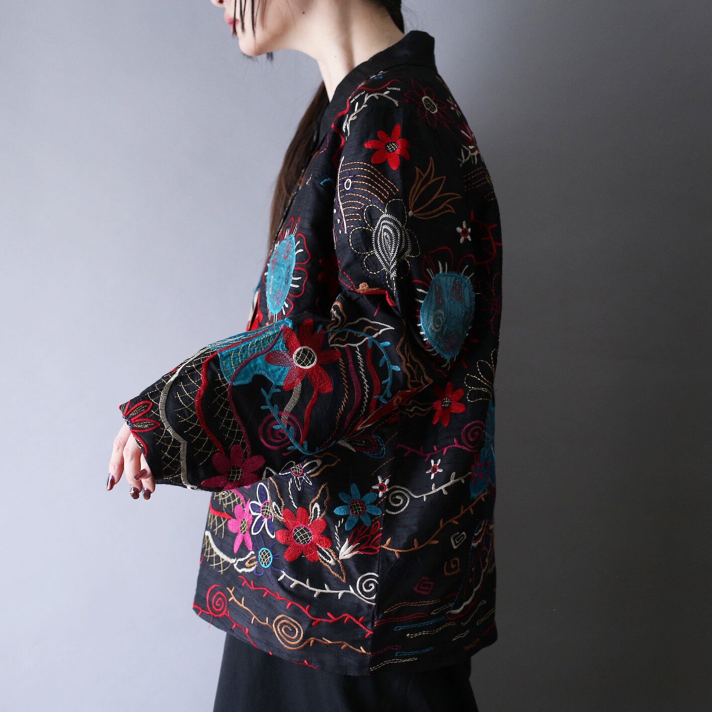 黒地によく映える高発色の赤や青緑とレトロな配色に花装飾は太めのステッチや刺繍で存在感しっかり、禍々しさを加速させる落書きのような独特なタッチも高ポイント。