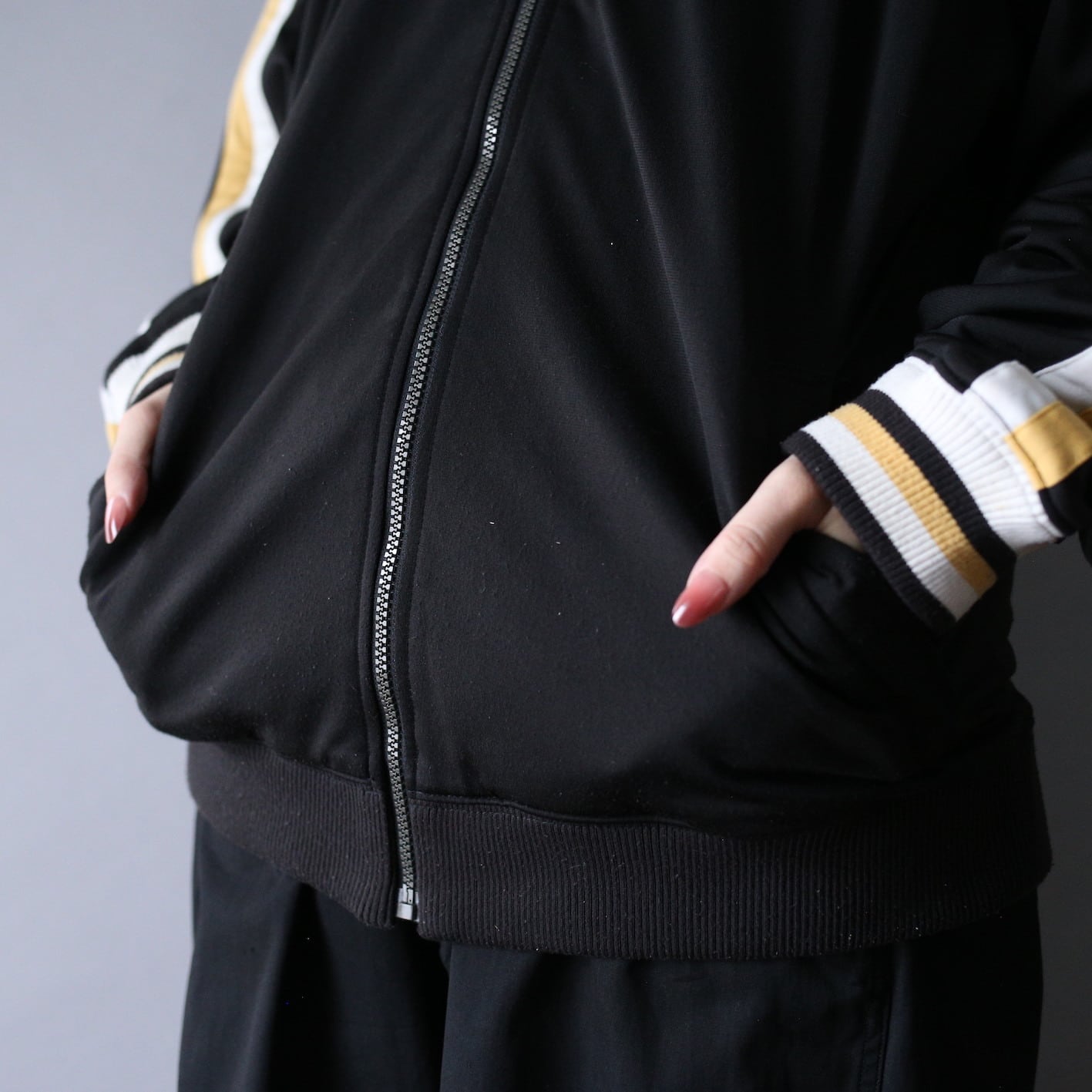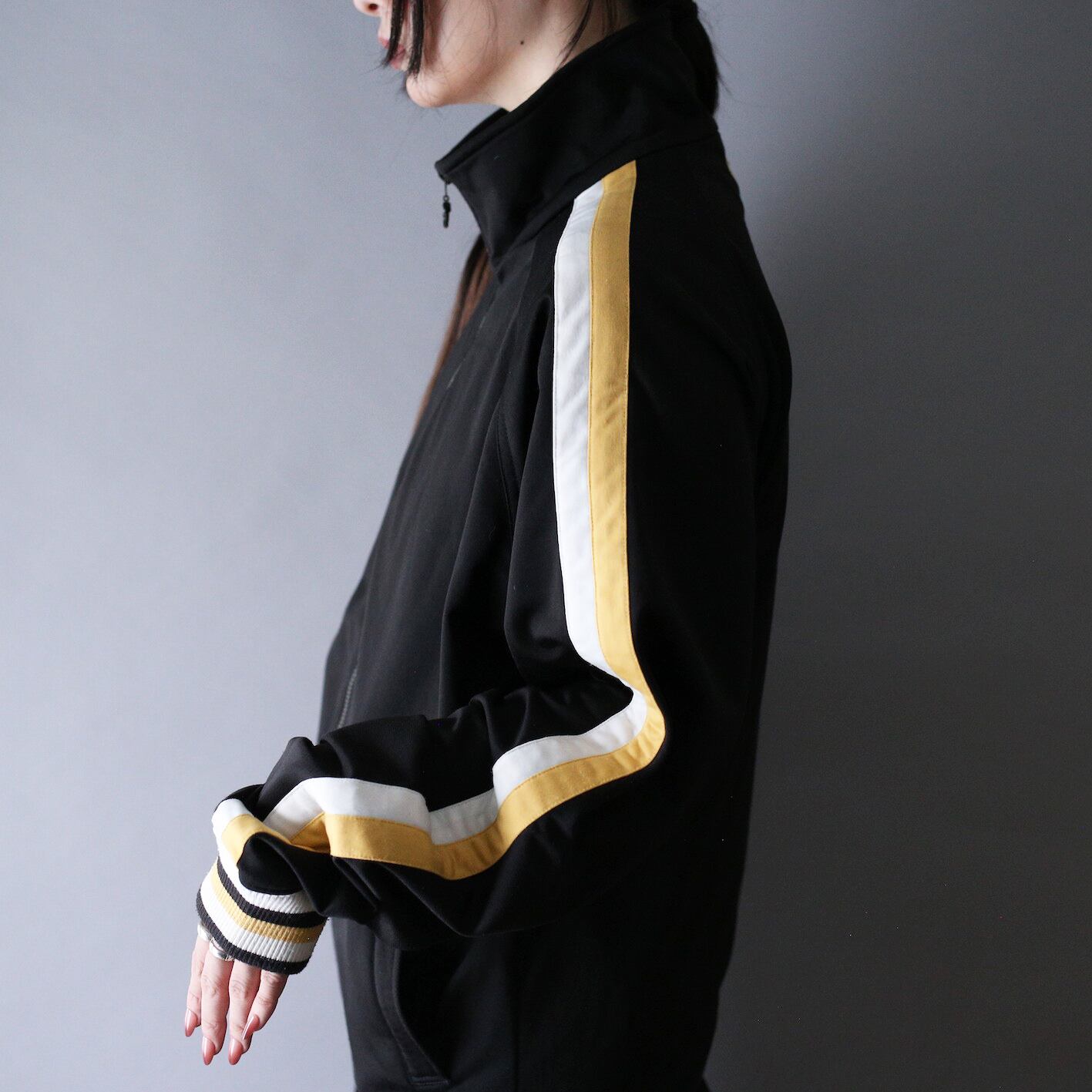 ブラックベースに”白×黄色”と一目でわかる良配色、襟から袖にかけてストンとラインを入れることで今っぽいサイバー感を兼ね備えたトレンディな1枚。