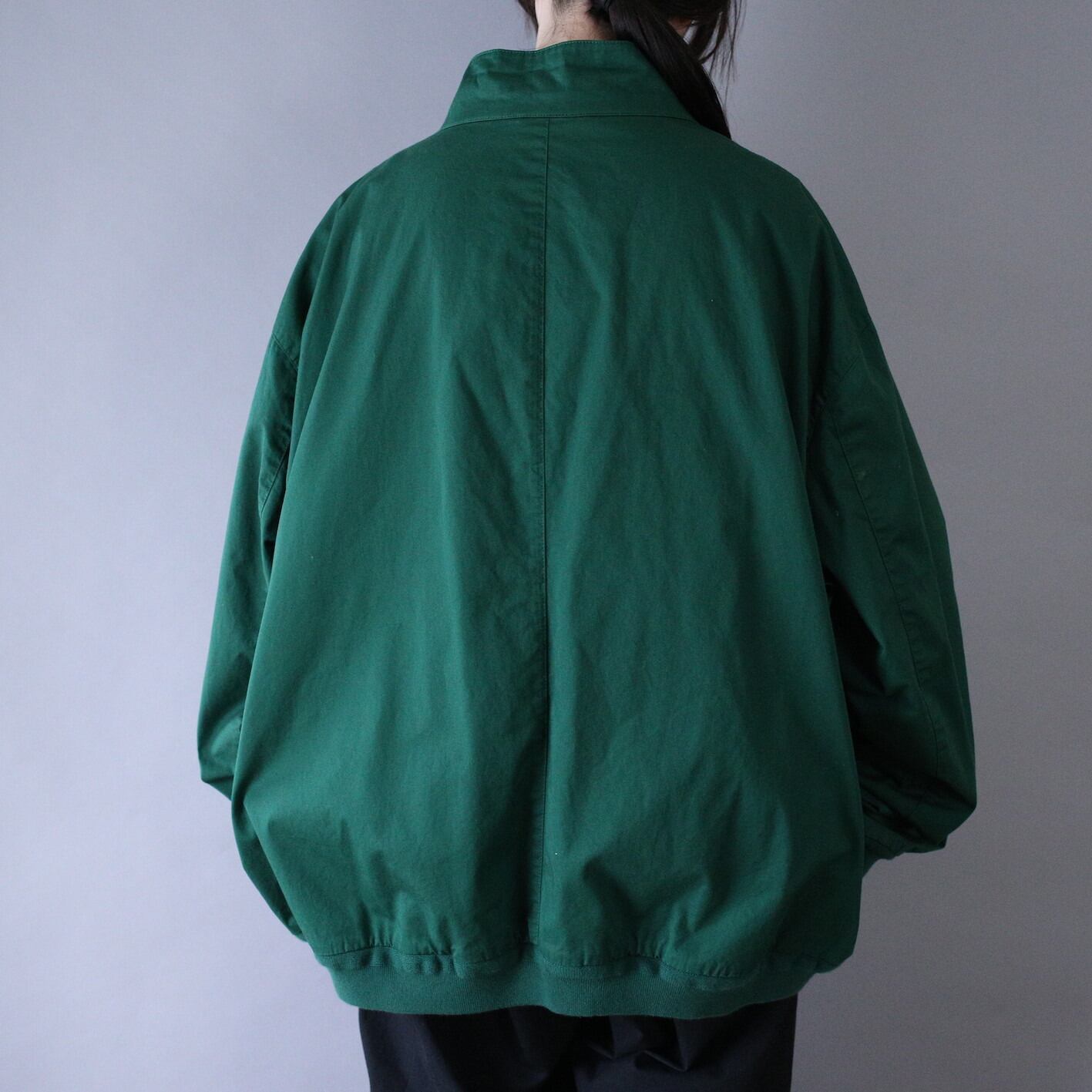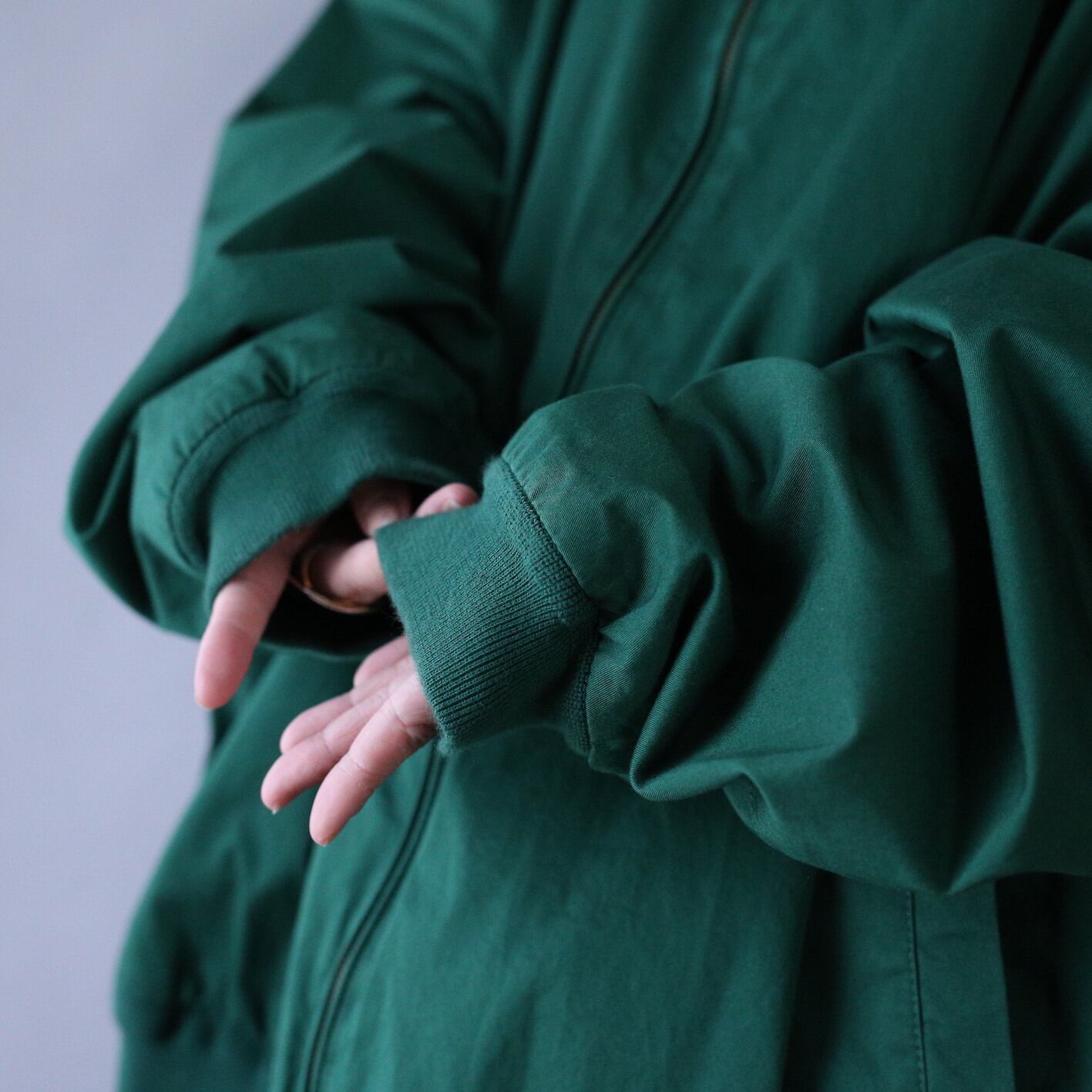 カラーは深みのあるグリーンと使い勝手が良く個性的なグッドカラーに金のジップが大人なエレガントムードを演出、さらに襟のボタンを閉めればハイネックと首元までこだわりの詰まったグッドシルエット◎